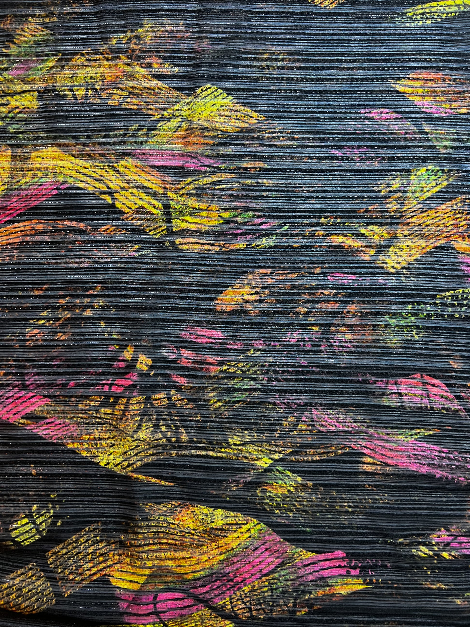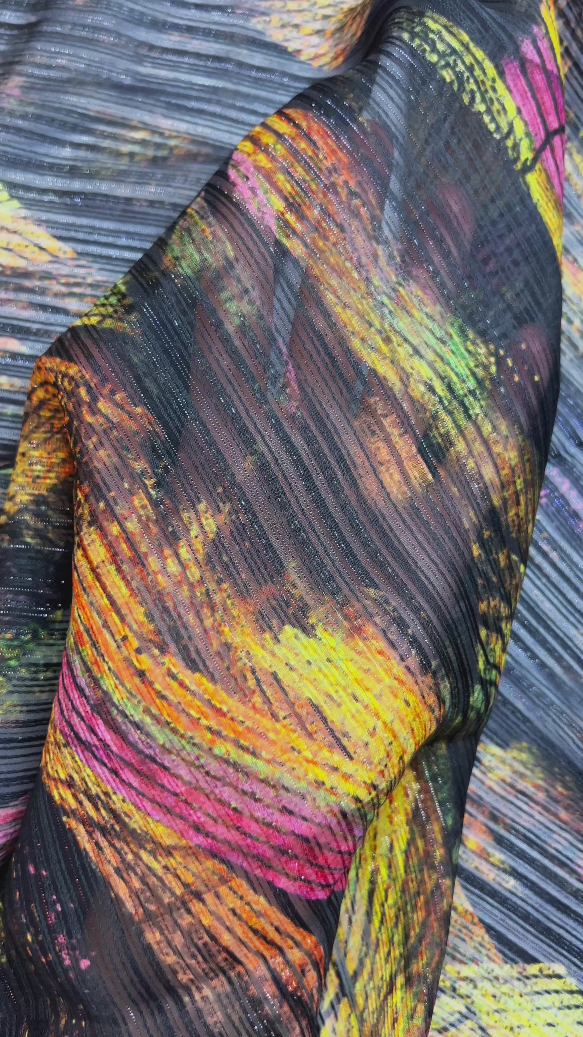 Ce tissu présente un fond noir élégant avec des touches éclatantes de rose, jaune et orange, rehaussées de fils lurex argentés qui ajoutent une subtile brillance et profondeur.