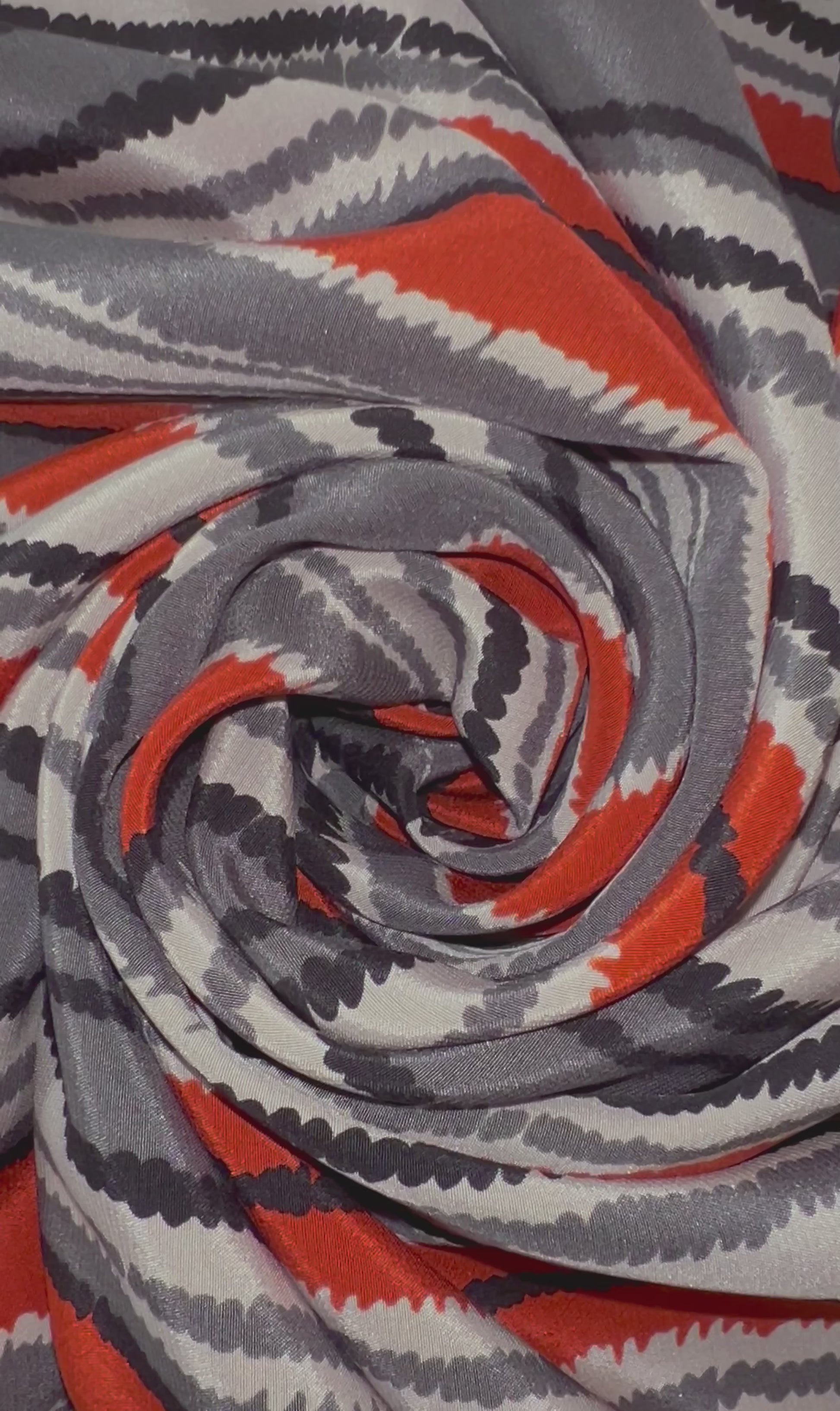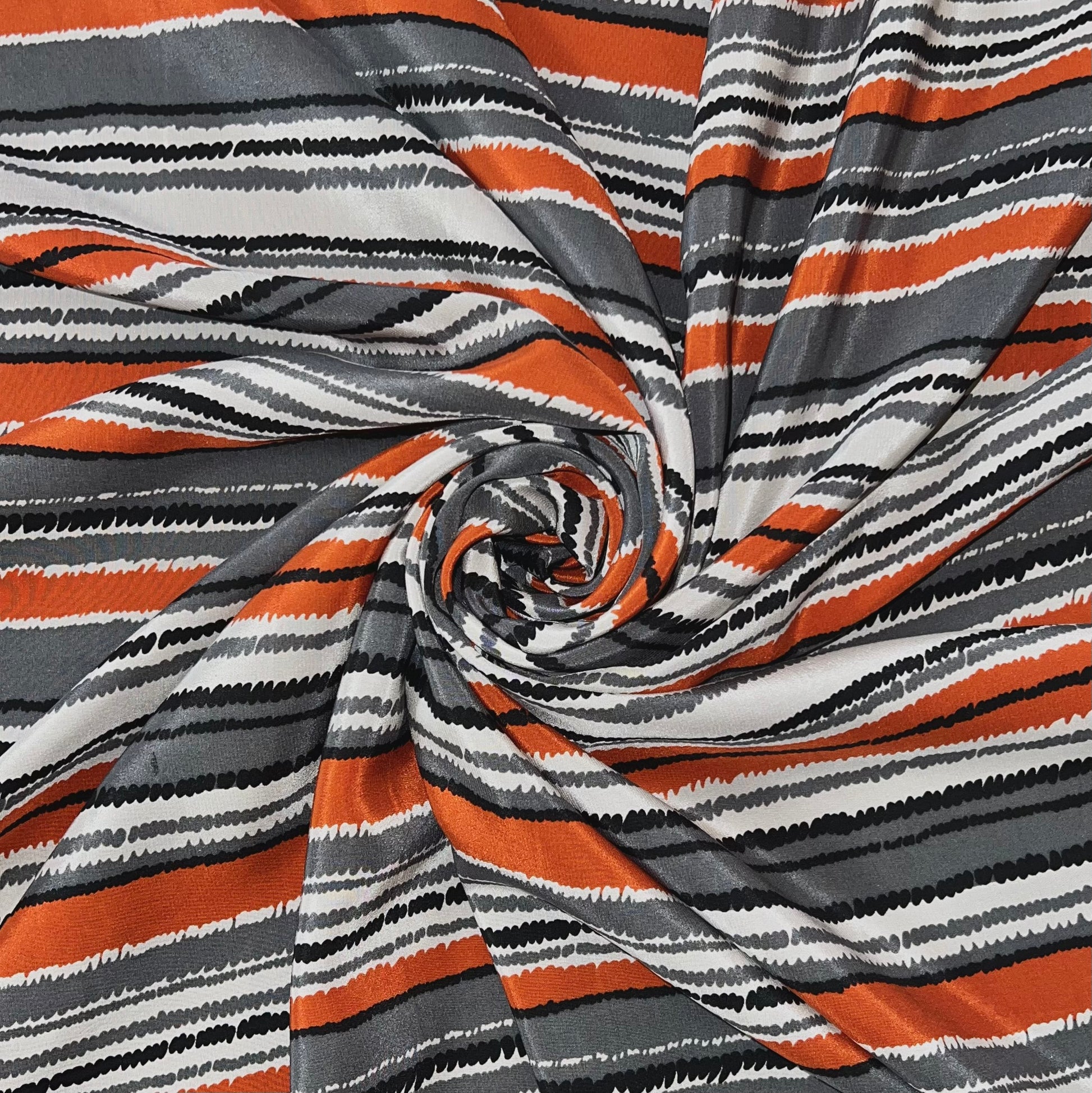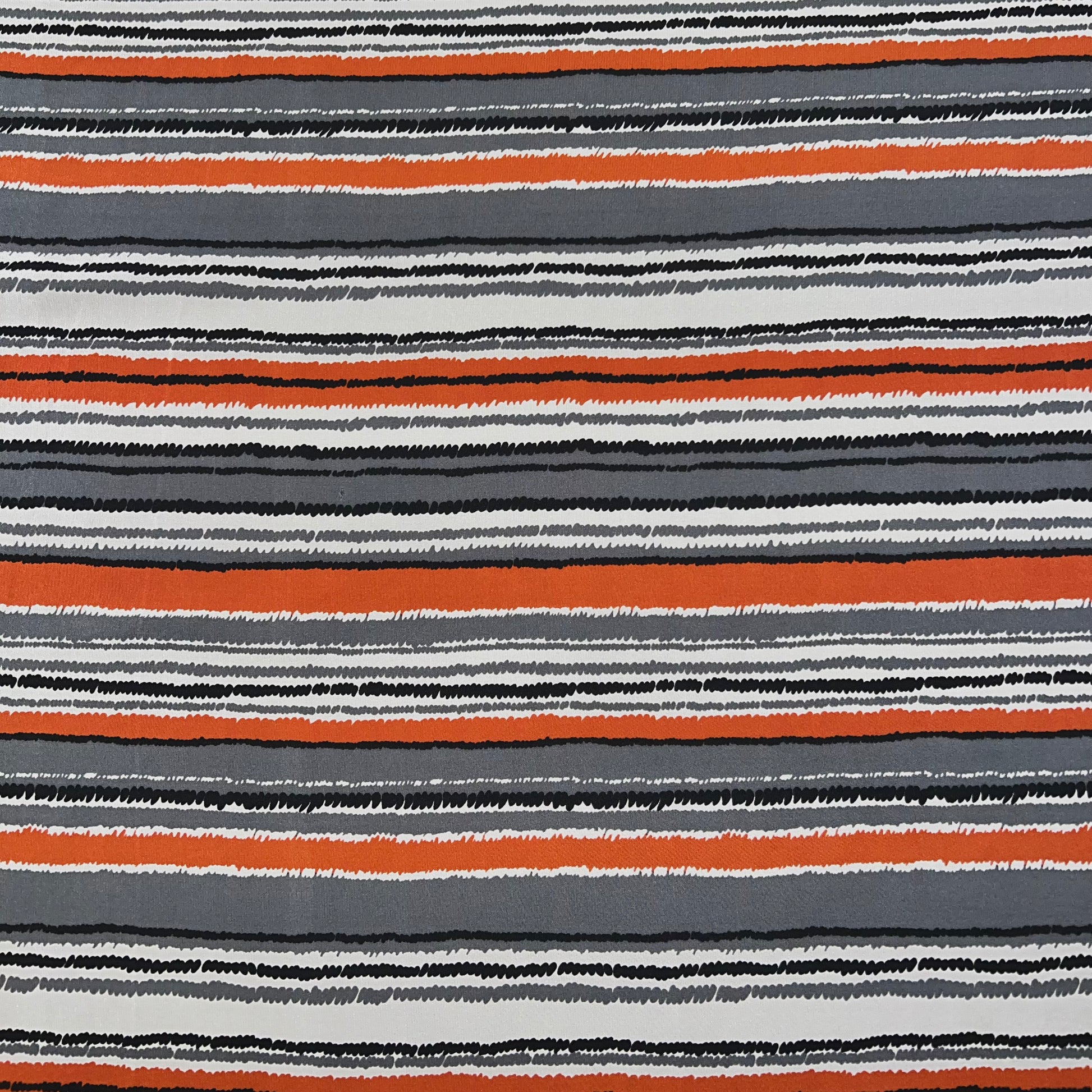 Avec son imprimé unique de rayures irrégulières en nuances d'orange, gris et noir sur un fond blanc éclatant, ce tissu est parfait pour créer des pièces qui ne passeront pas inaperçues.