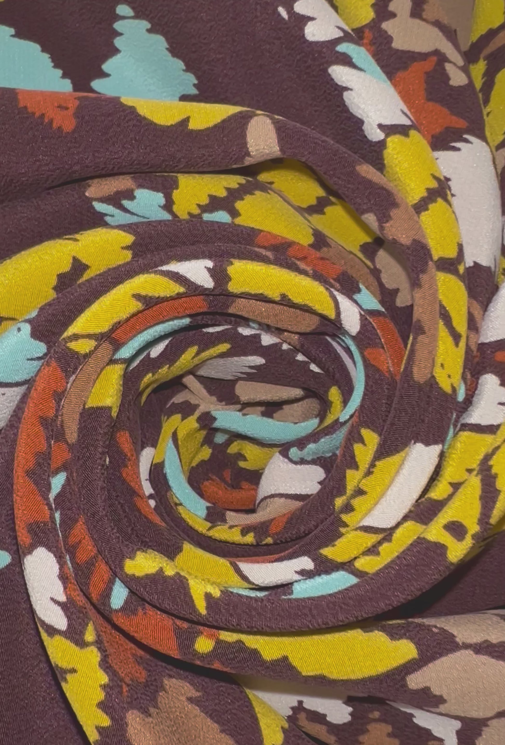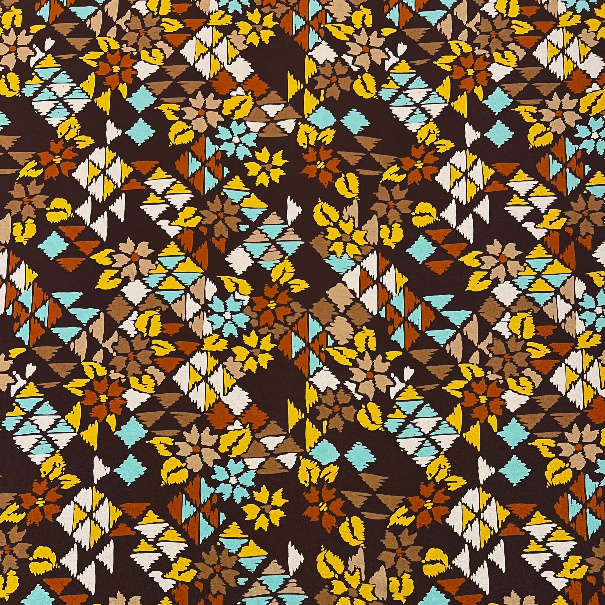 Les couleurs dominantes de cet imprimé sont dans les tons automnaux, incluant des nuances chaleureuses telles que le terracotta, la noisette, le brun et quelques touches de jaune avec une petite touche estival de bleu turquoise.