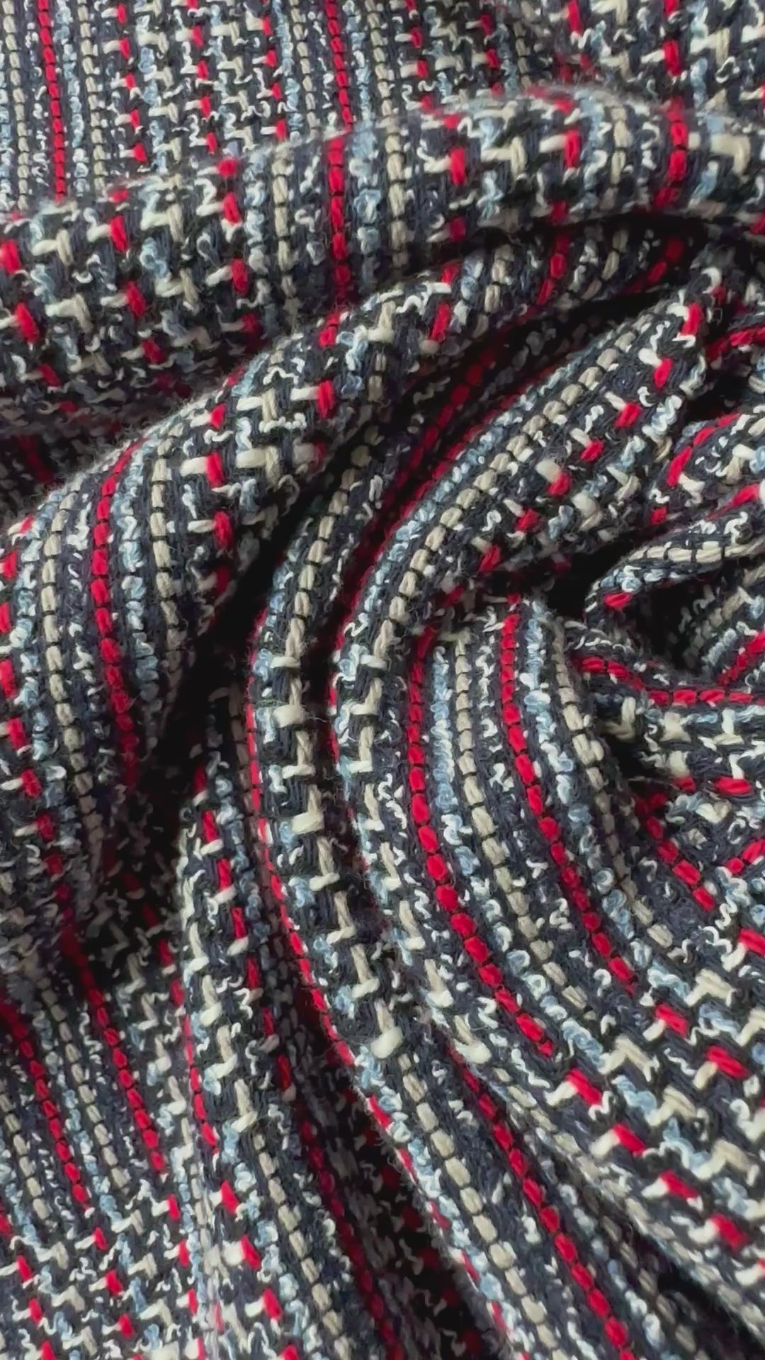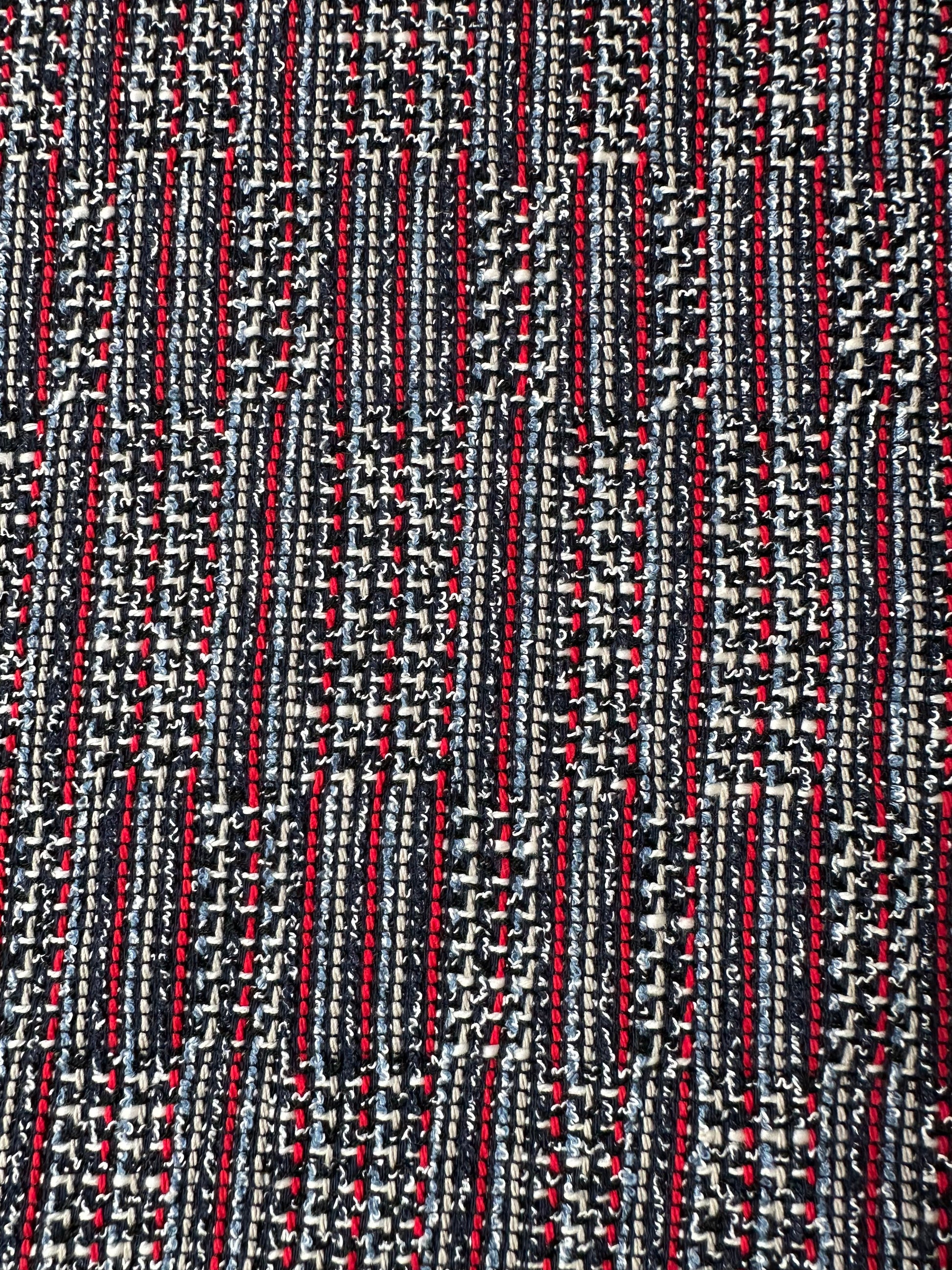 Issu d’un tissage raffiné, il marie avec subtilité des fils rouge profond, bleu marine, bleu ciel et blanc naturel pour créer un motif vibrant, au rythme graphique captivant.