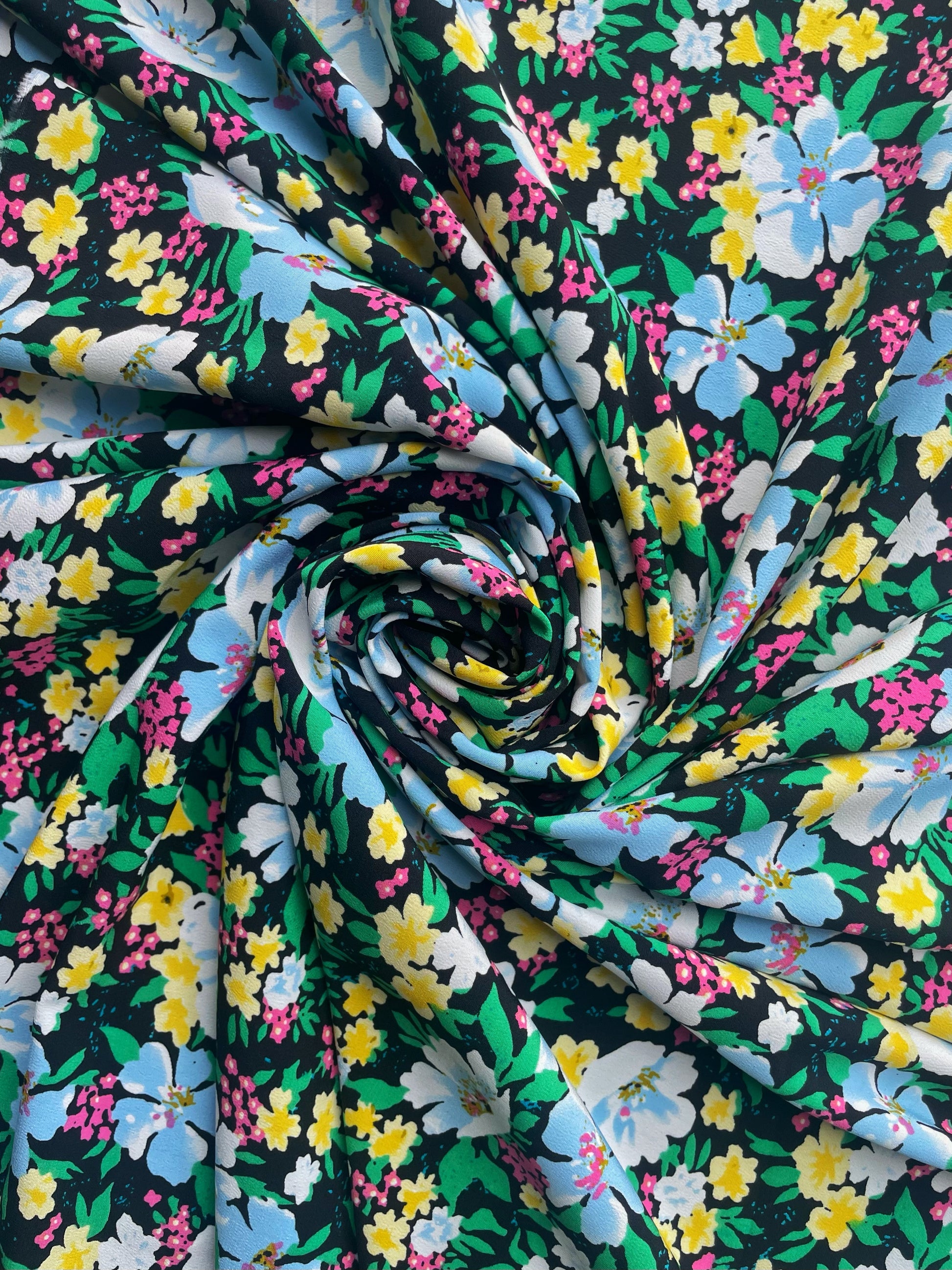 Ses motifs floraux raffinés et harmonieux créent un jeu de formes et de couleurs délicat, apportant une touche romantique et sophistiquée à vos créations. La fluidité du crêpe offre un tombé léger et élégant, idéal pour des pièces confortables et stylées.