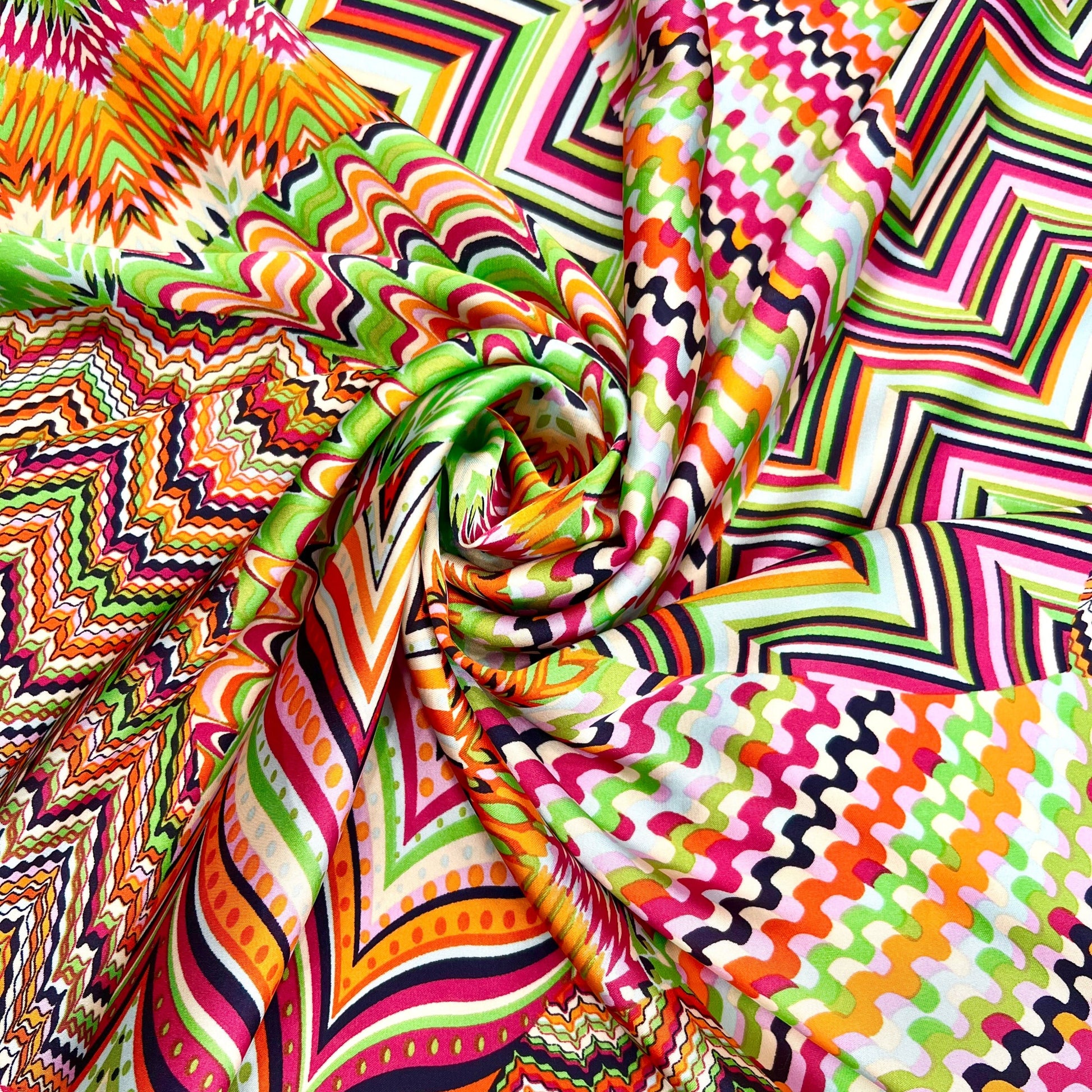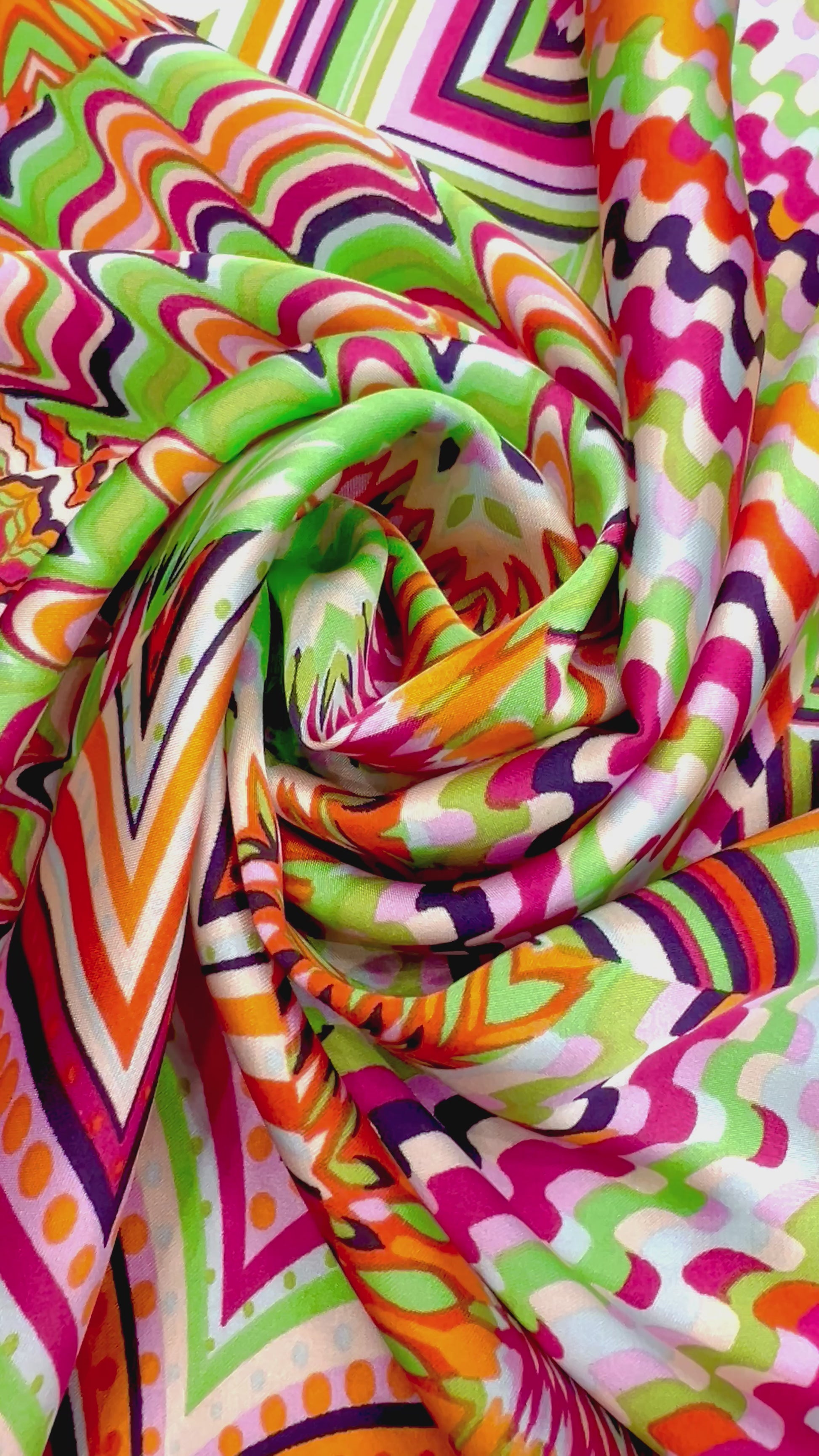 Découvrez l'élégance de notre satin synthétique au toucher soie, orné d'un motif abstrait vibrant aux couleurs estivales. Ce tissu allie la douceur luxueuse de la soie à la durabilité du satin synthétique, offrant un drapé fluide et élégant.