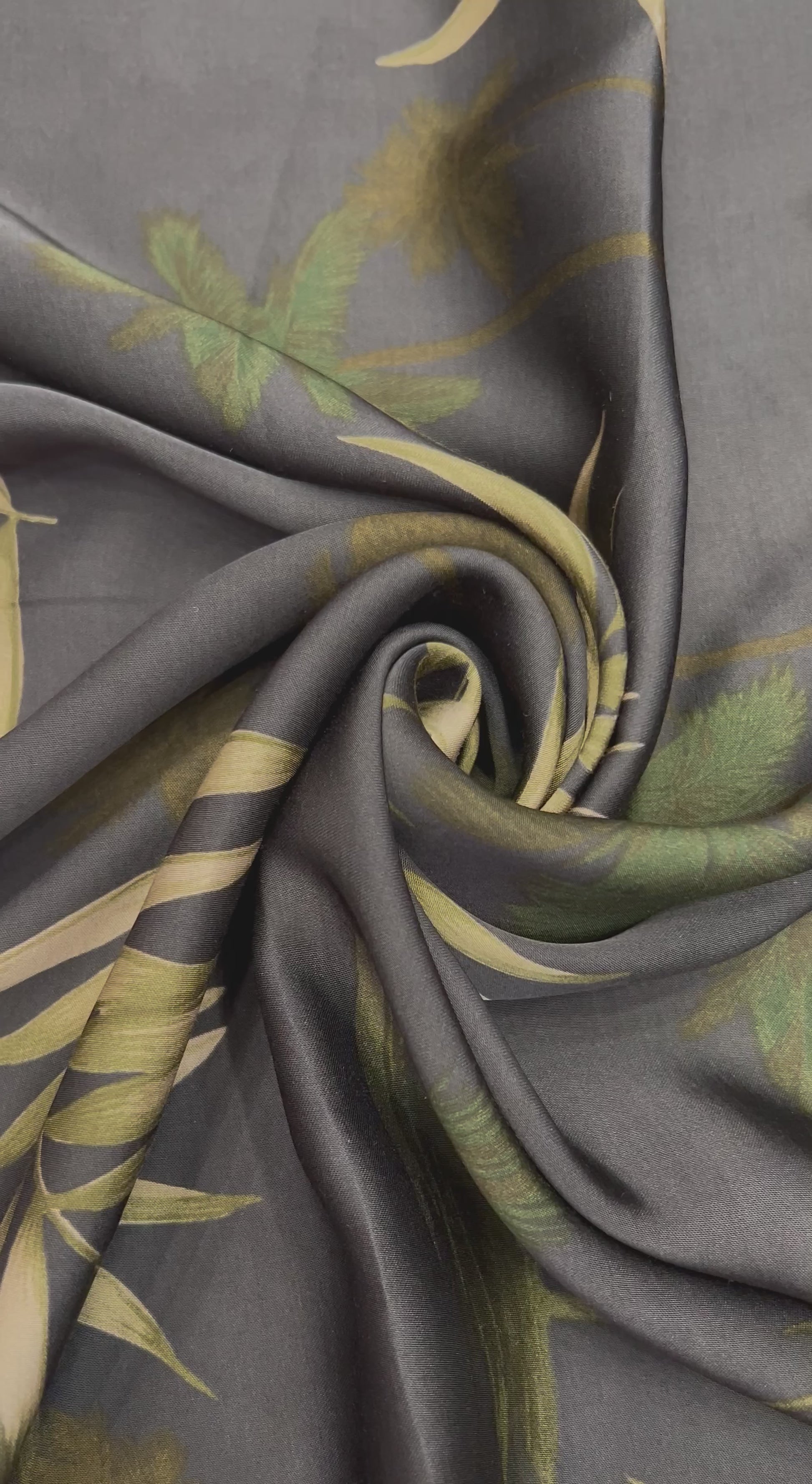Ce satin de viscose imprimé sur fond gris foncé est une véritable invitation au raffinement et à l'élégance.