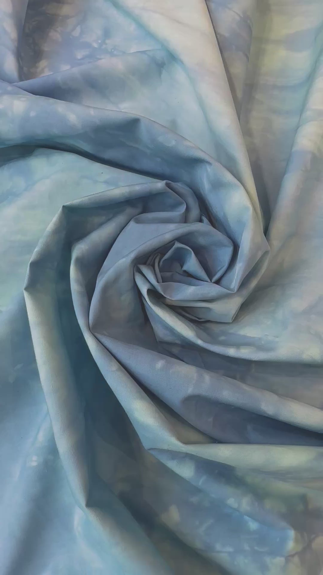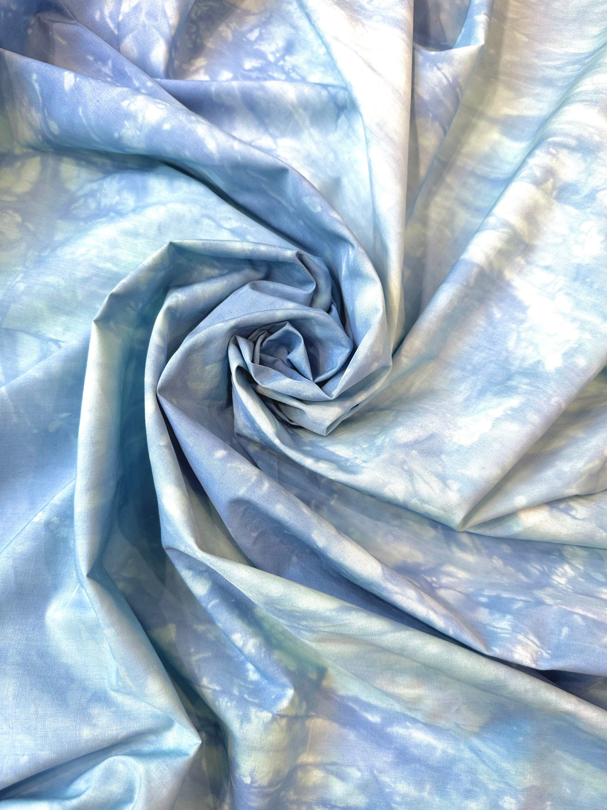 Laissez-vous séduire par cette popeline de coton française au motif tie and dye dans des nuances aériennes de bleu ciel, relevées de touches blanches délicates.