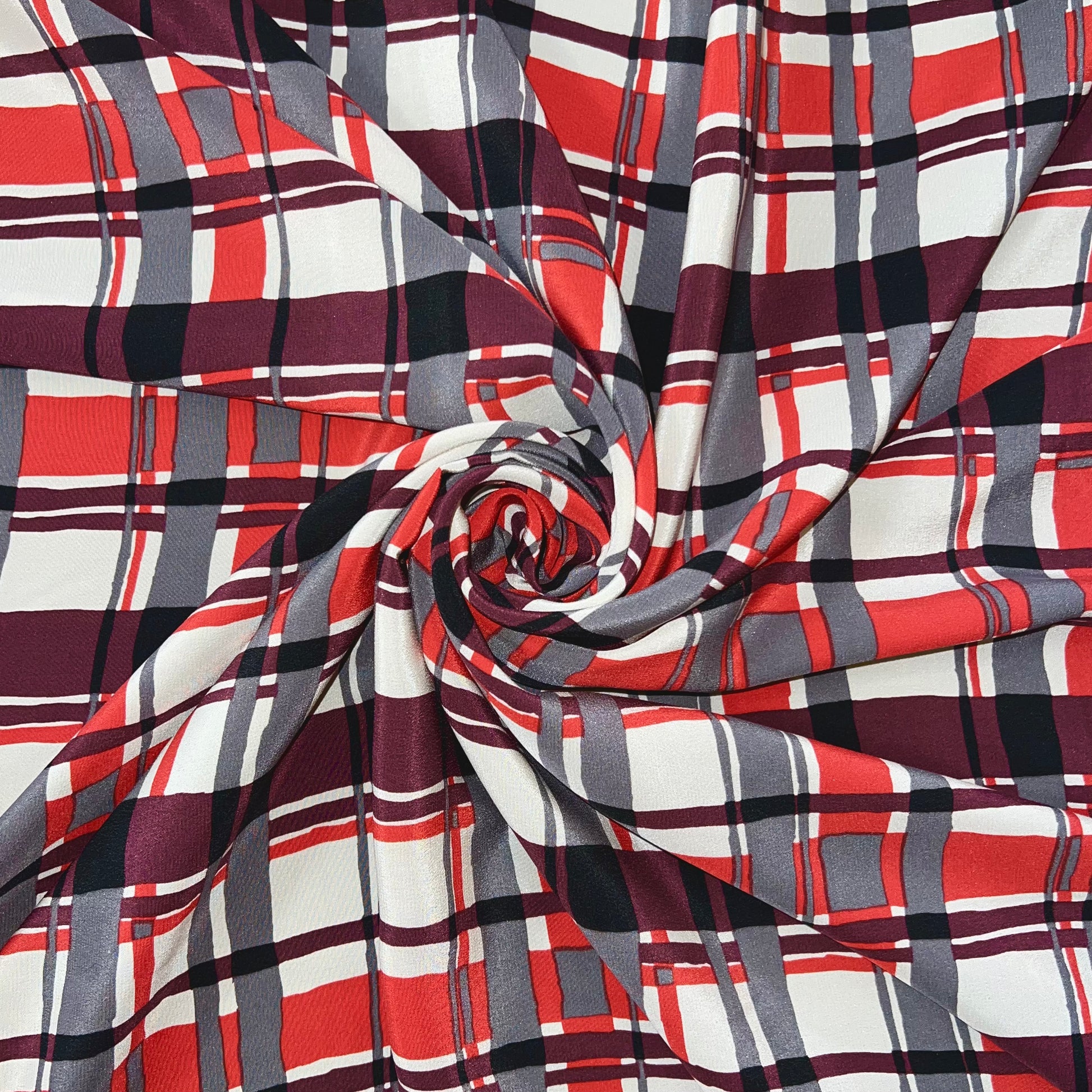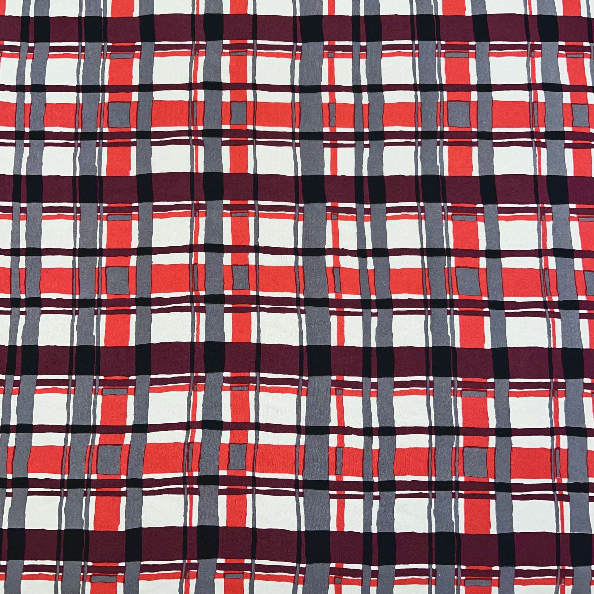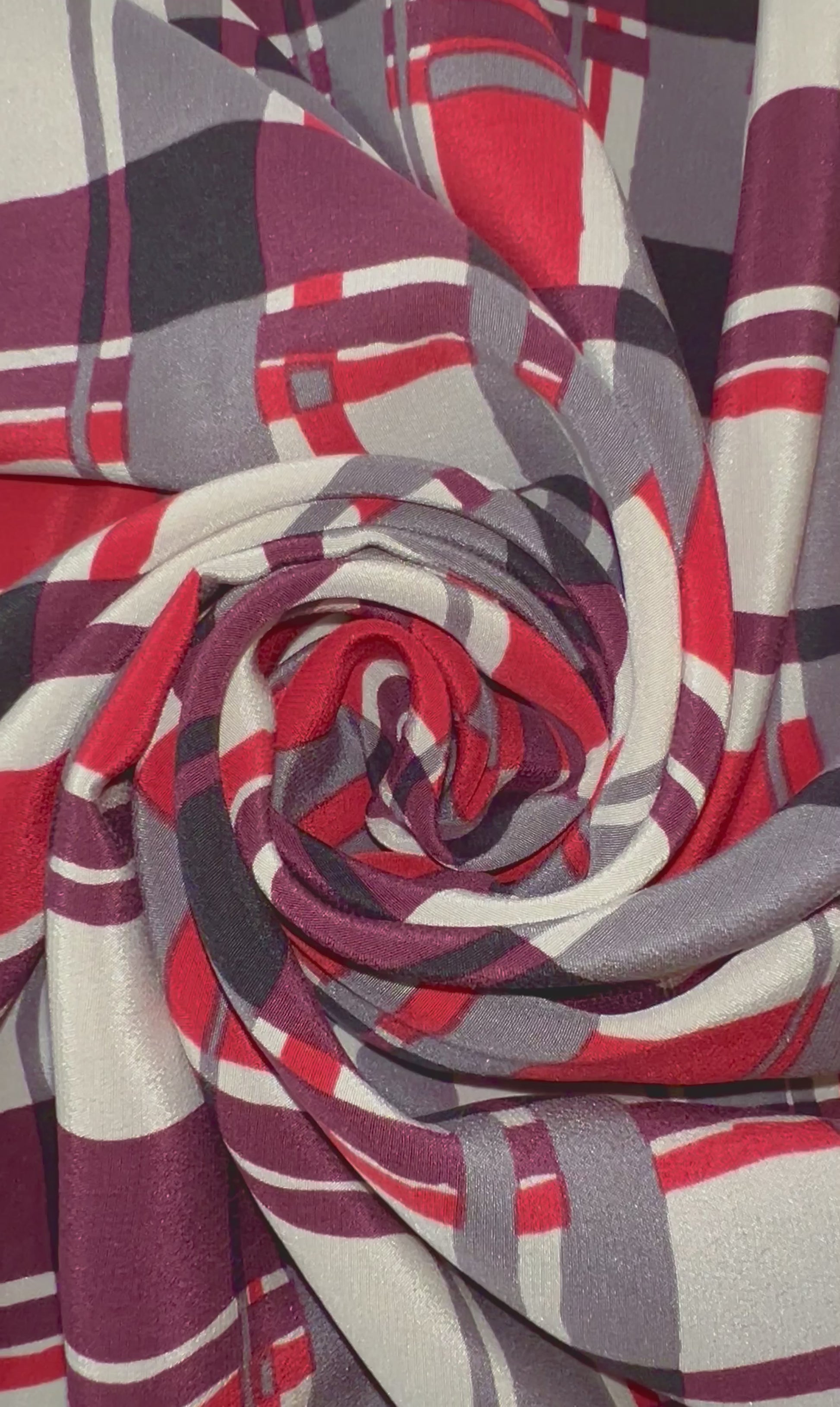 un rouge vif intense, du bordeaux, un gris élégant et un blanc pur se marient harmonieusement pour donner à ce tissu une allure à la fois sophistiquée et énergique.