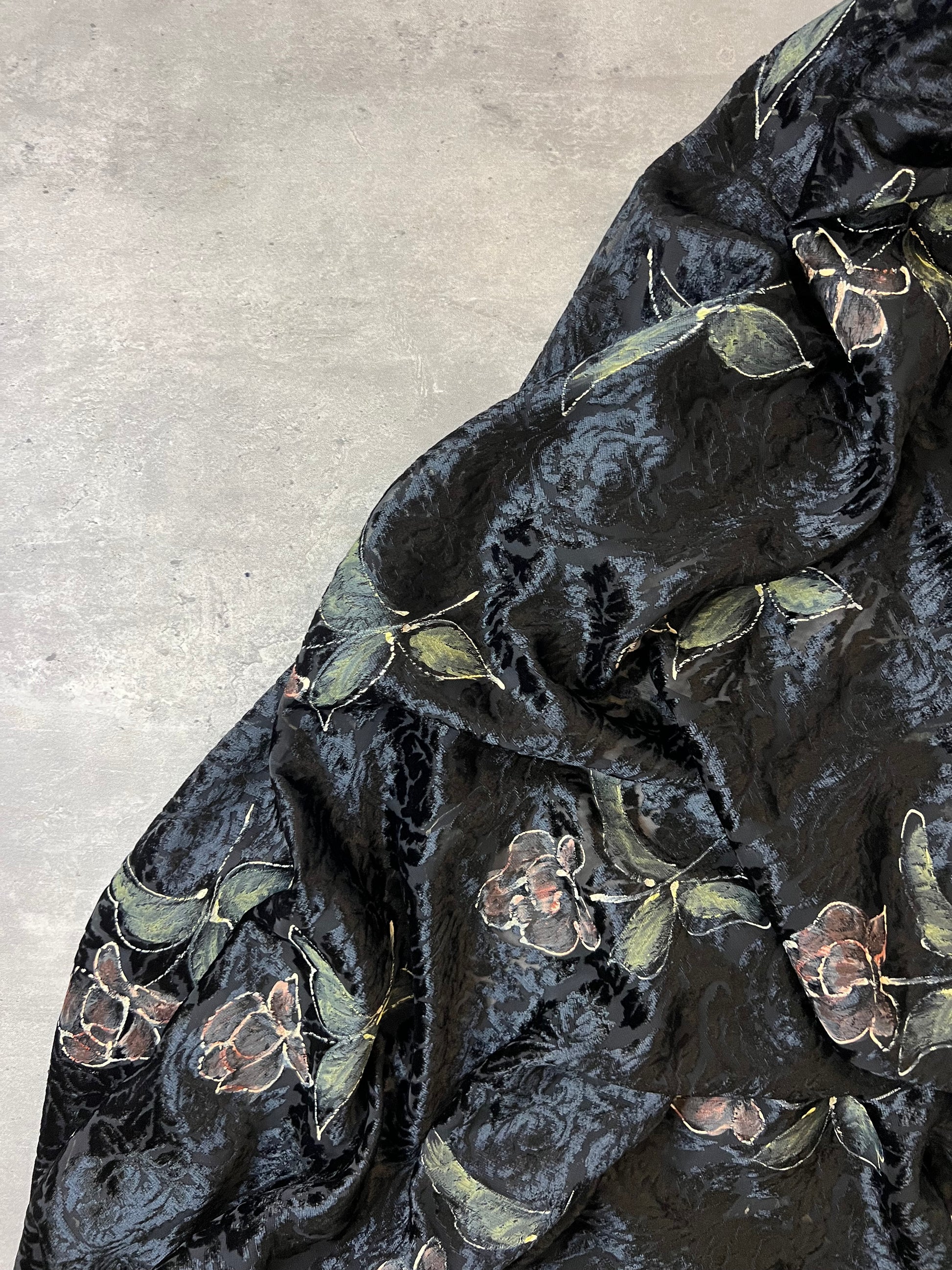 Ce tissu luxueux présente des motifs floraux délicats, sublimés par la technique du dévoré et rehaussés par des touches de peinture, ajoutant une touche artistique et sophistiquée.
