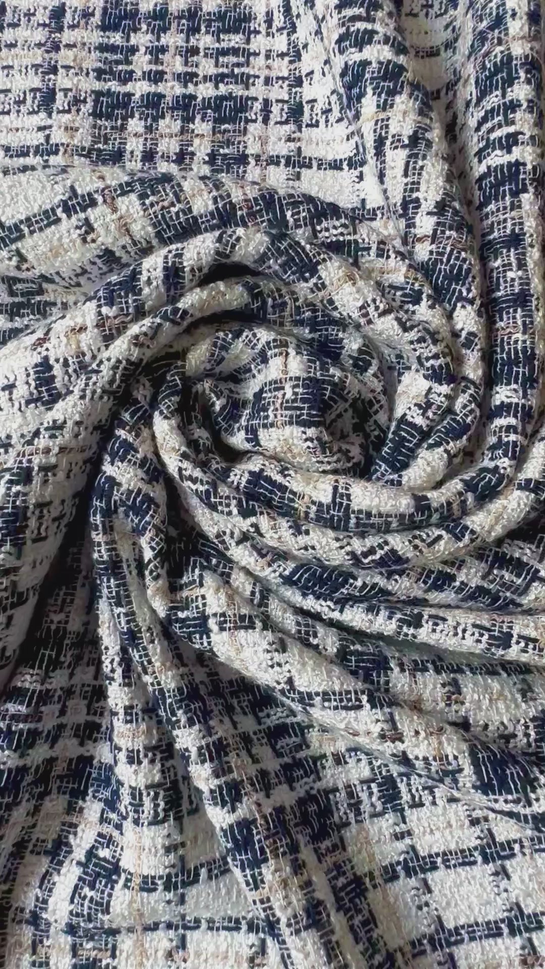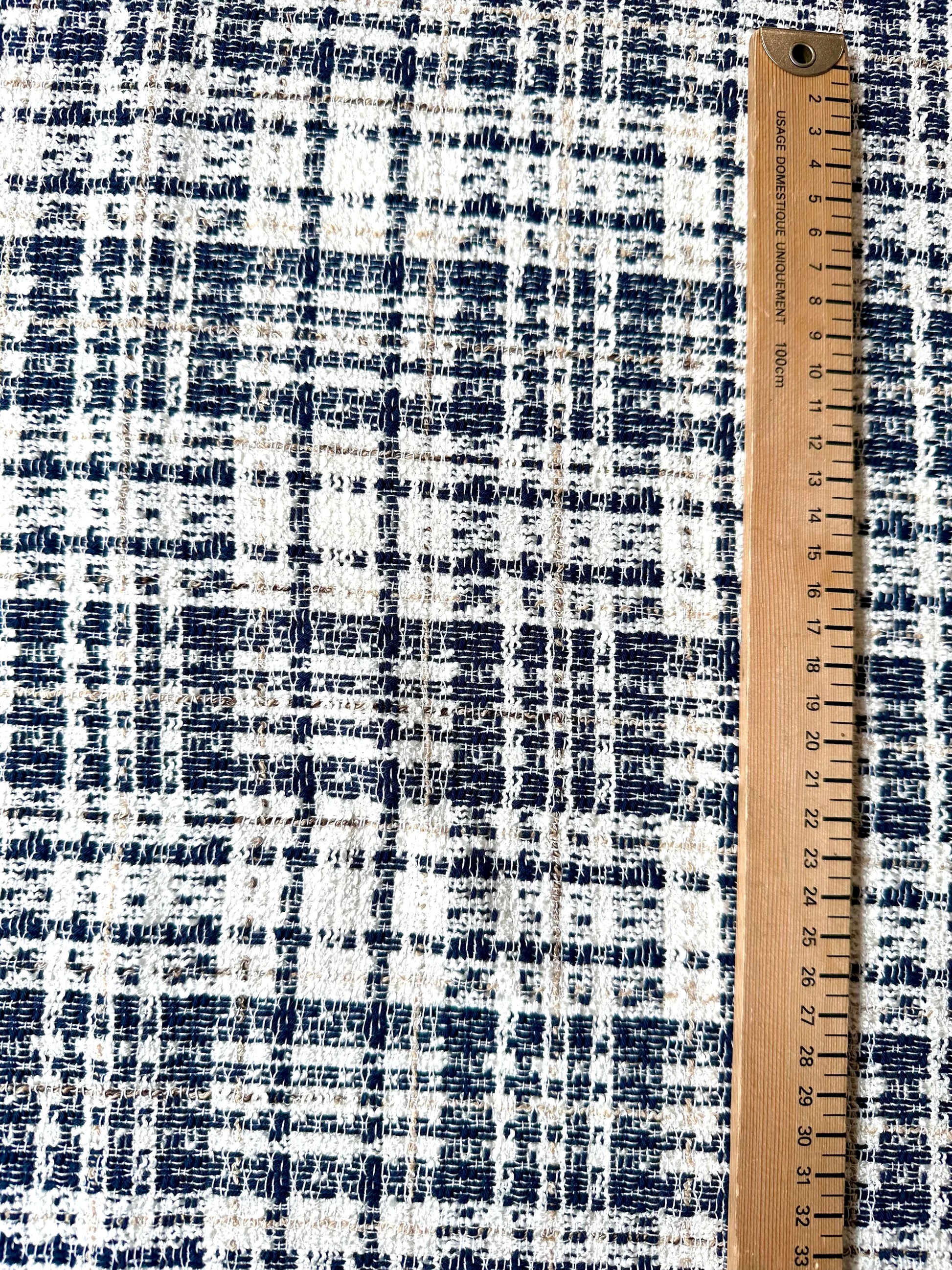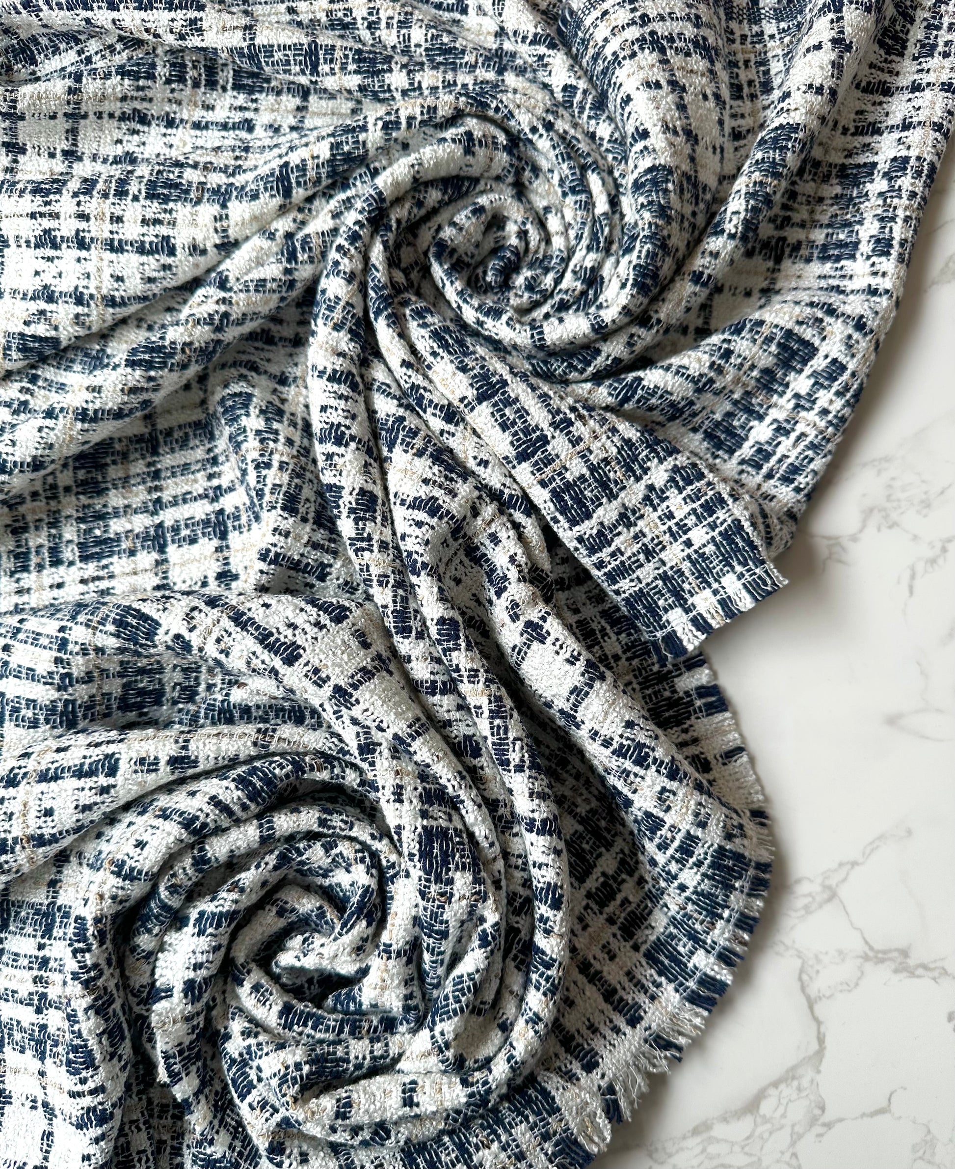 Élégant et texturé, ce tweed 100% coton séduit par son tissage expressif mêlant fils bleu marine profonds, beiges sableux et blancs lumineux. Son motif à carreaux désordonnés, d’inspiration chic parisien, apporte un look à la fois structuré et vivant, parfait pour des créations sophistiquées.