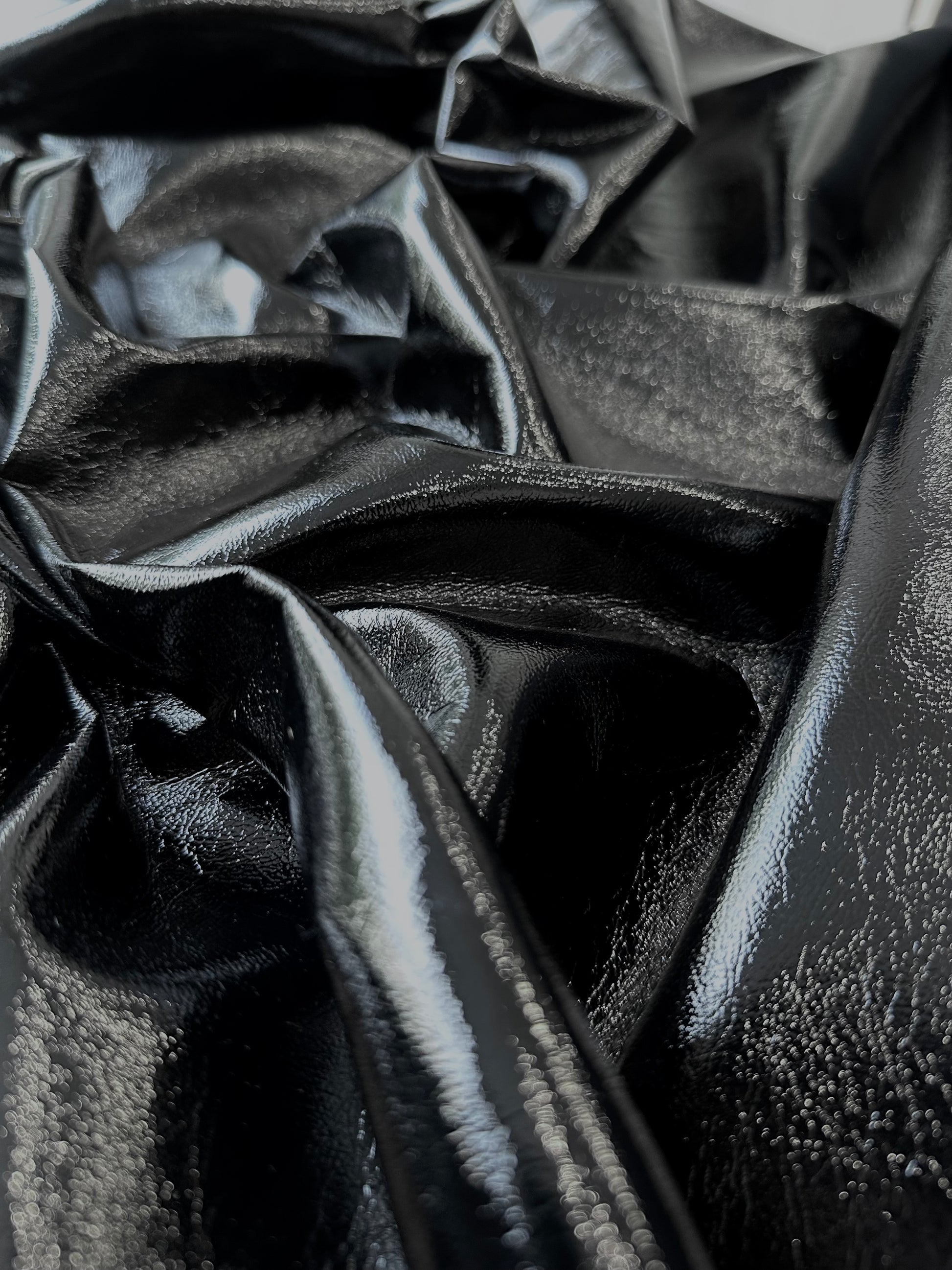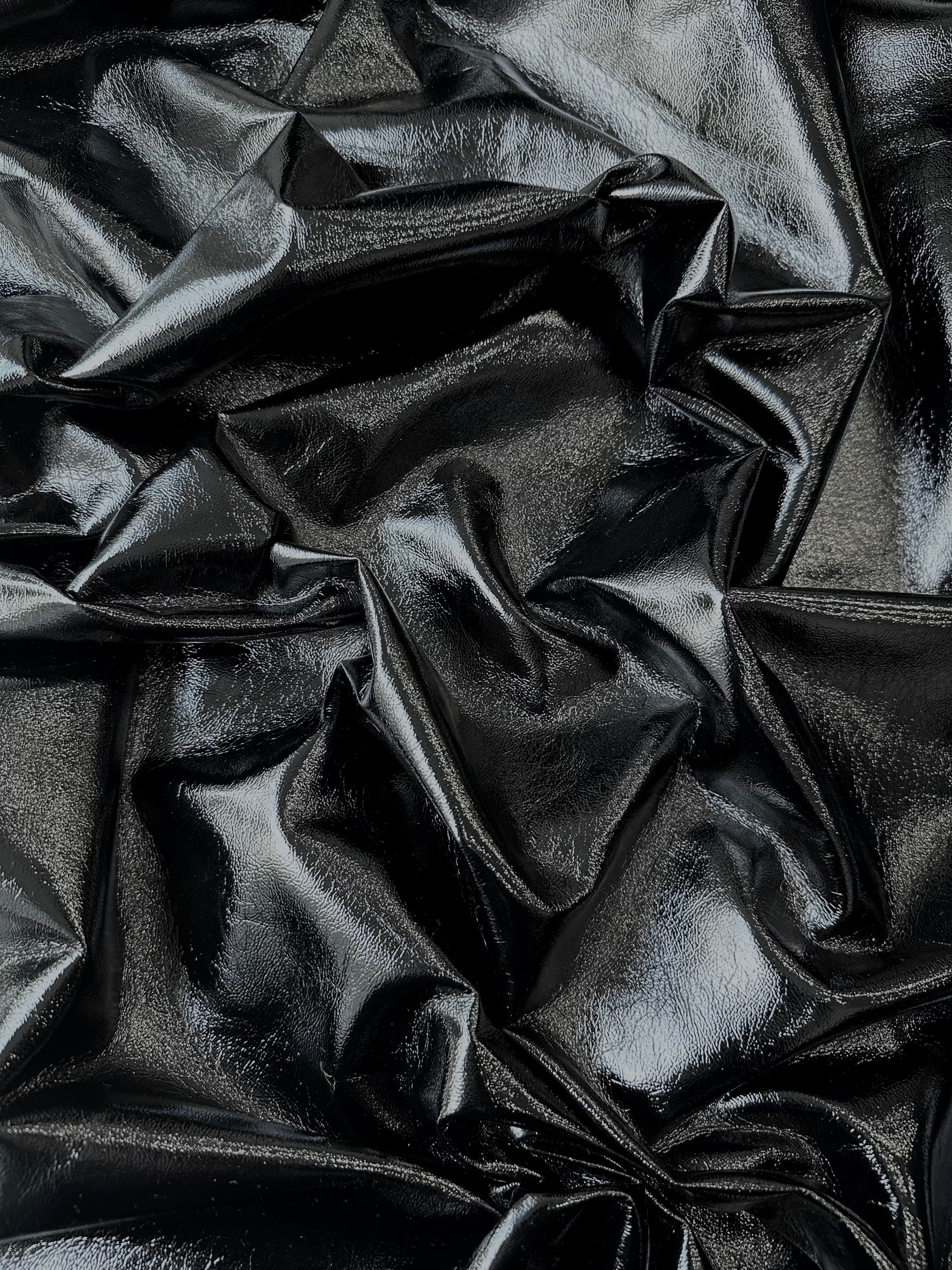 Ce simili cuir noir texturé se distingue par sa finition brillante et son grain subtil, qui lui donnent une allure à la fois audacieuse et élégante.