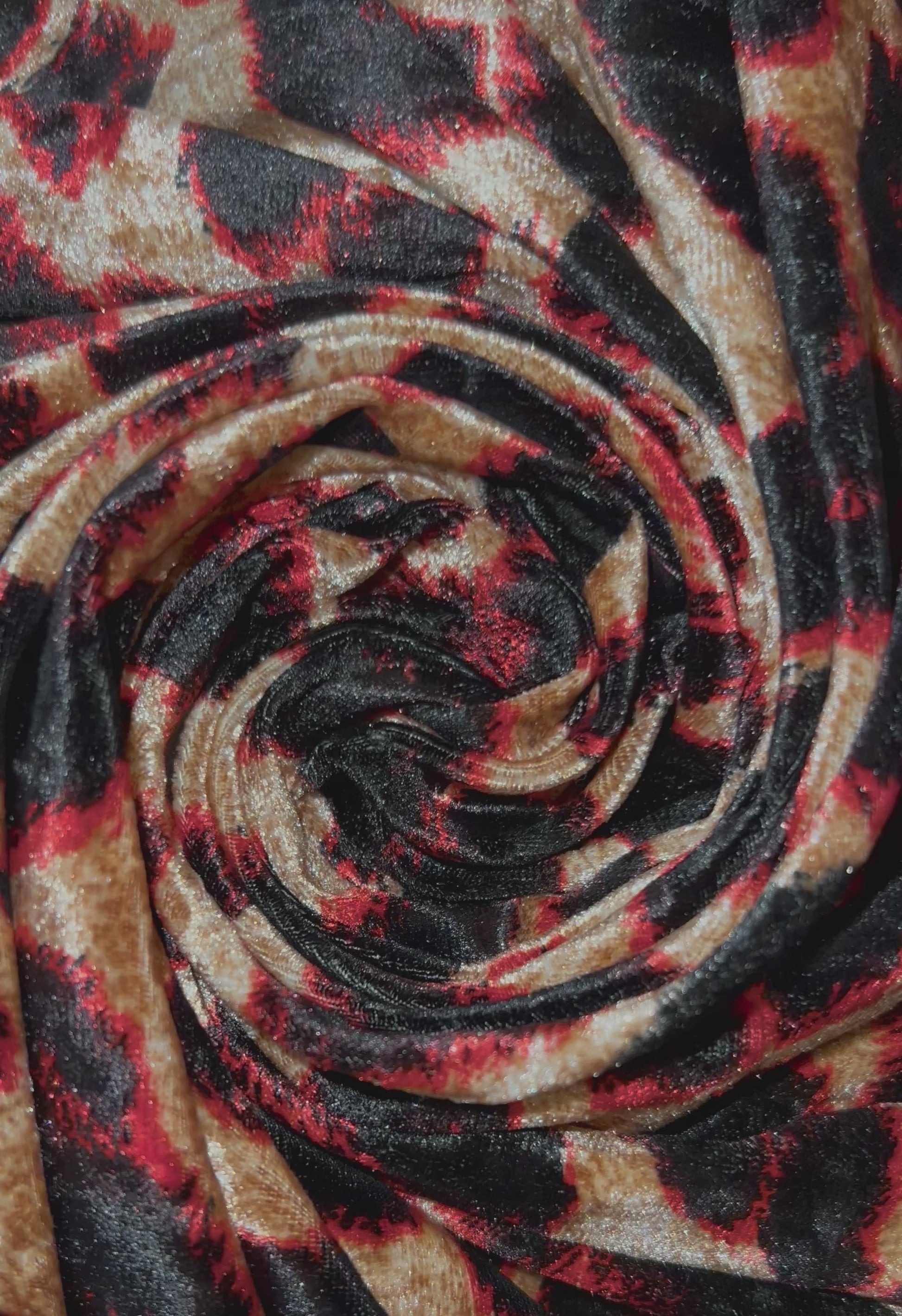 Ce textile se distingue par un motif léopard captivant, où des taches noires profondes se mêlent à des accents rouges, le tout sur un fond beige chaleureux qui évoque la nature sauvage.