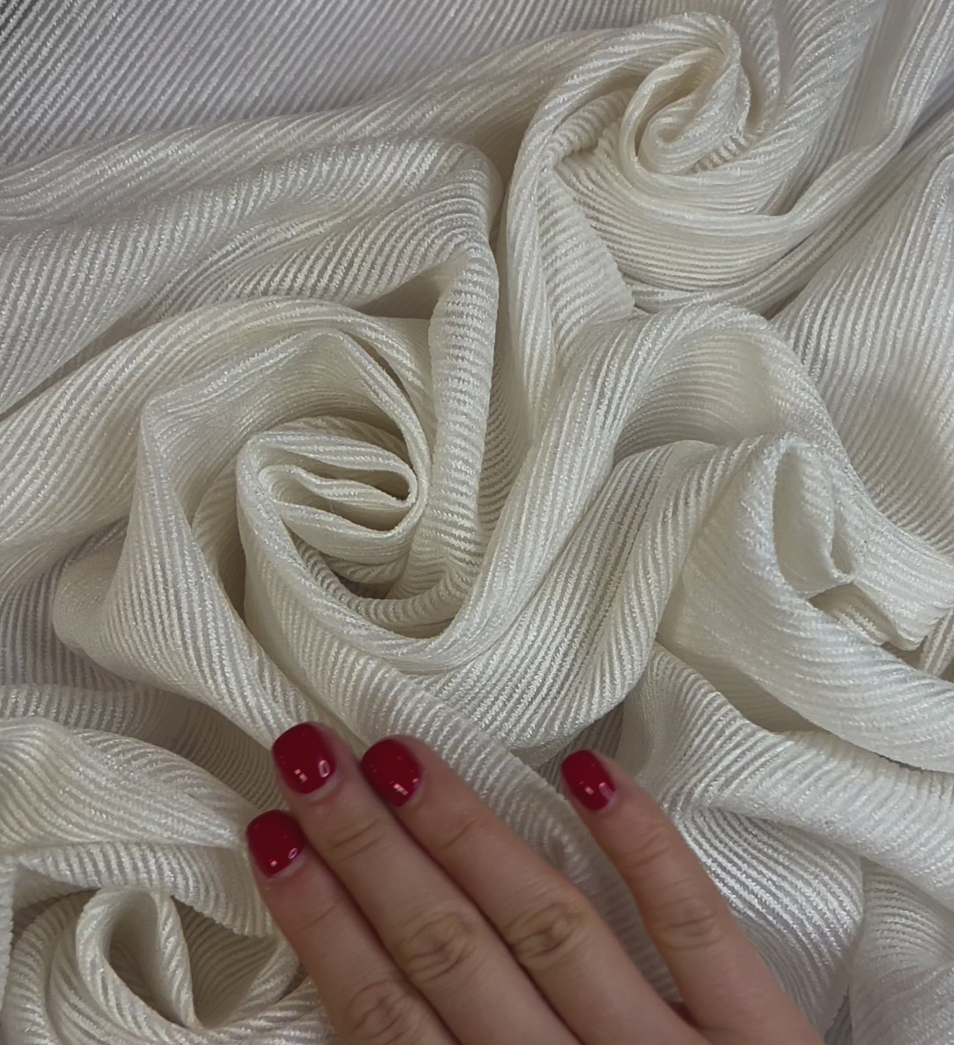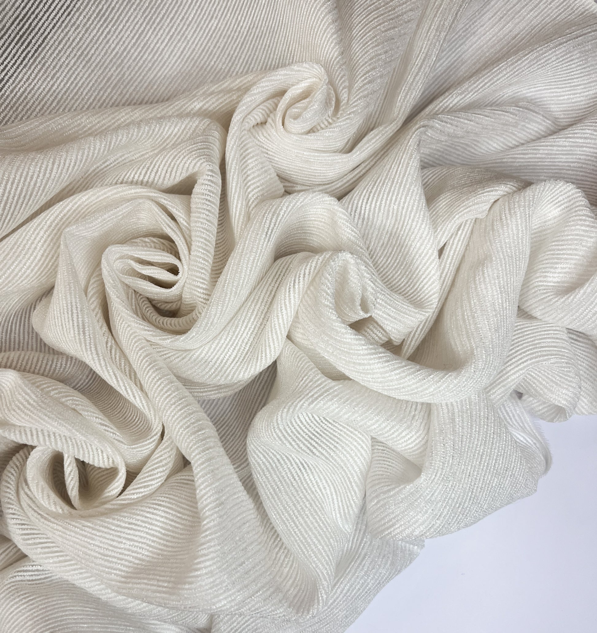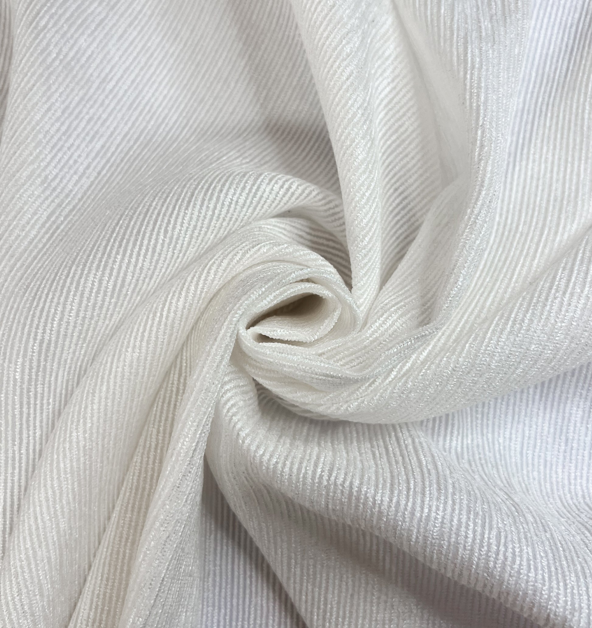 Ce tissu blanc ivoire à reflets nacrés capture et diffuse la lumière avec une élégance intemporelle, le rendant parfait pour des vêtements haut de gamme comme des chemisiers, robes de soirée, ou accessoires délicats.