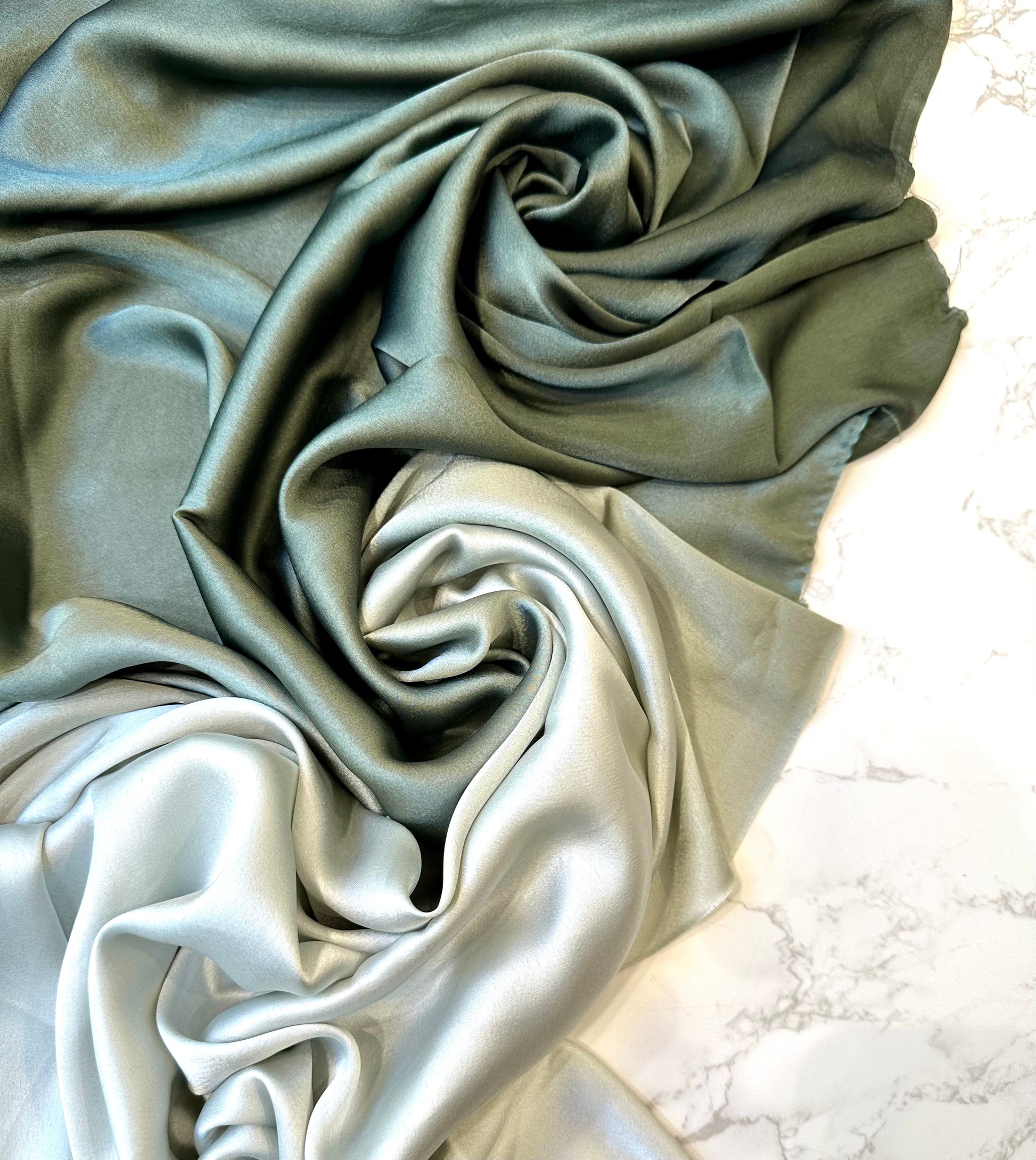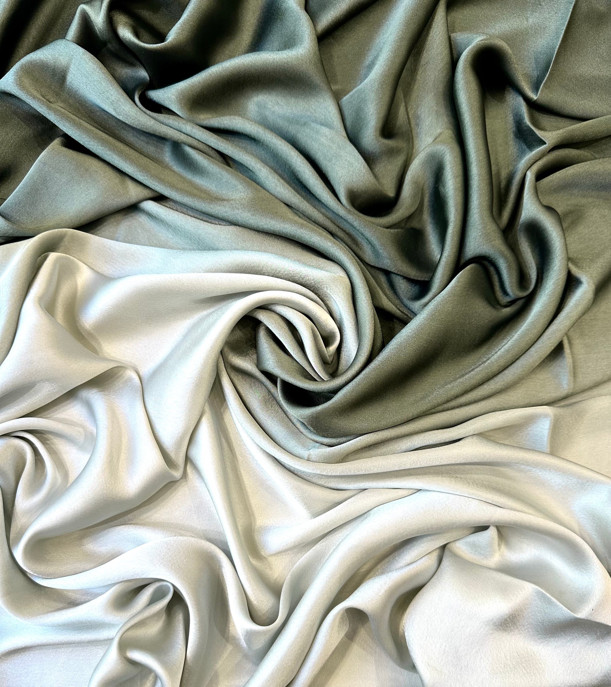 Plongez dans la douceur visuelle et tactile de notre satin en acétate 100 %, magnifié par un dégradé harmonieux allant du vert kaki lumineux à la douceur du vert bardane qui est un blanc avec une légère touche de vert.