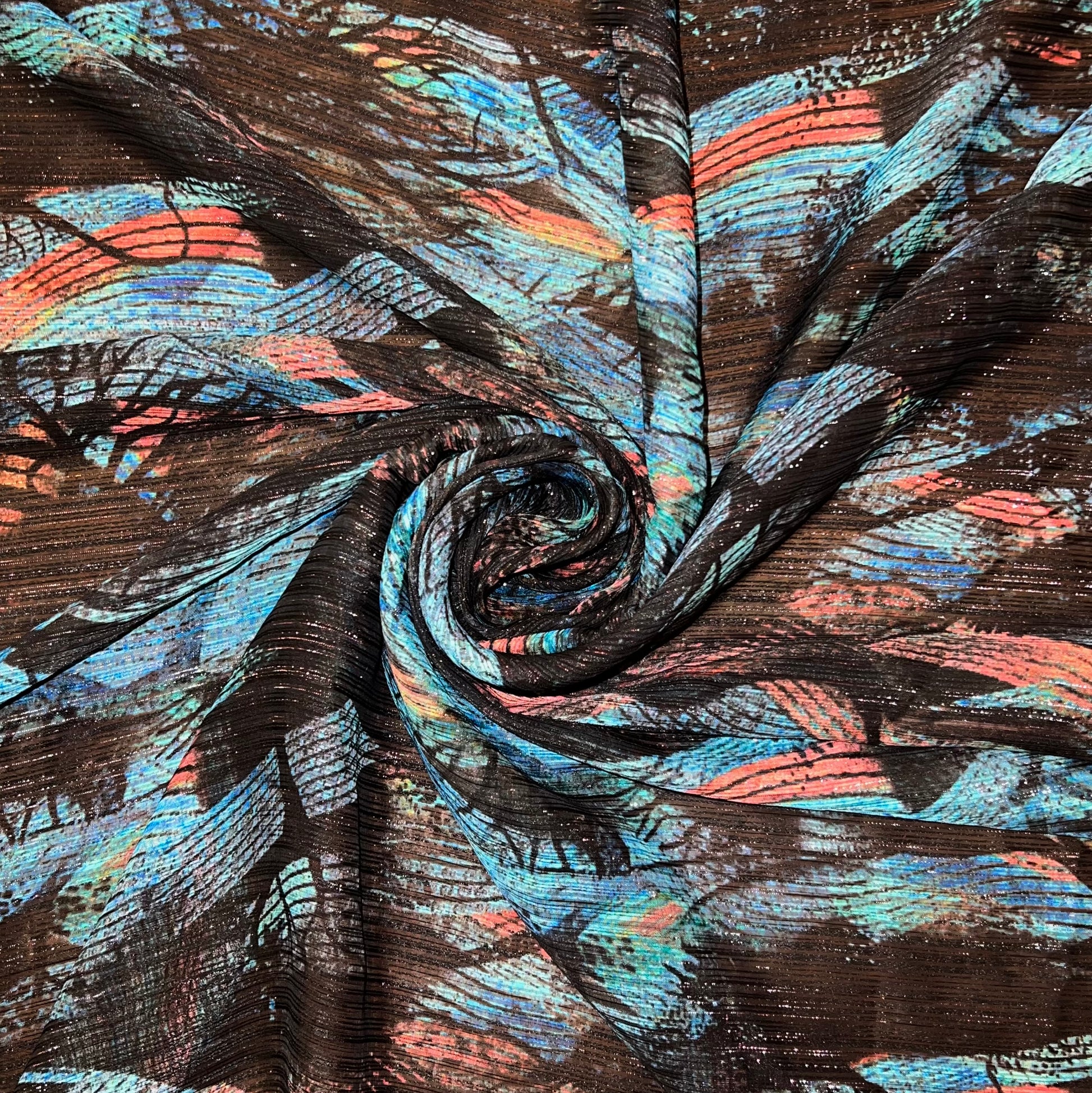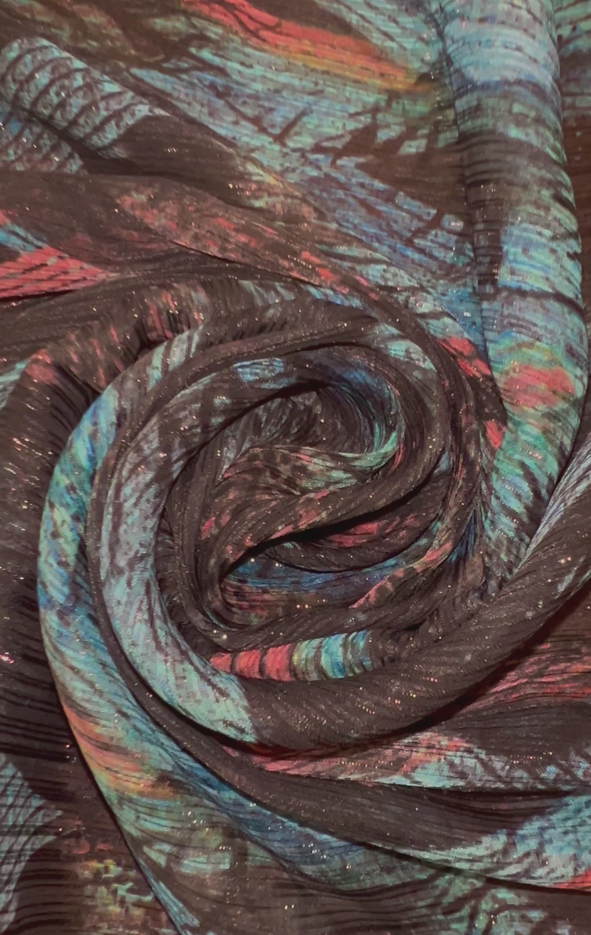 L'aspect le plus envoûtant de cette mousseline réside dans ses reflets brillants. Chaque couleur, chaque trait de l'imprimé semble prendre vie sous la lumière, capturant des éclats métalliques qui ajoutent une dimension luxueuse au tissu.