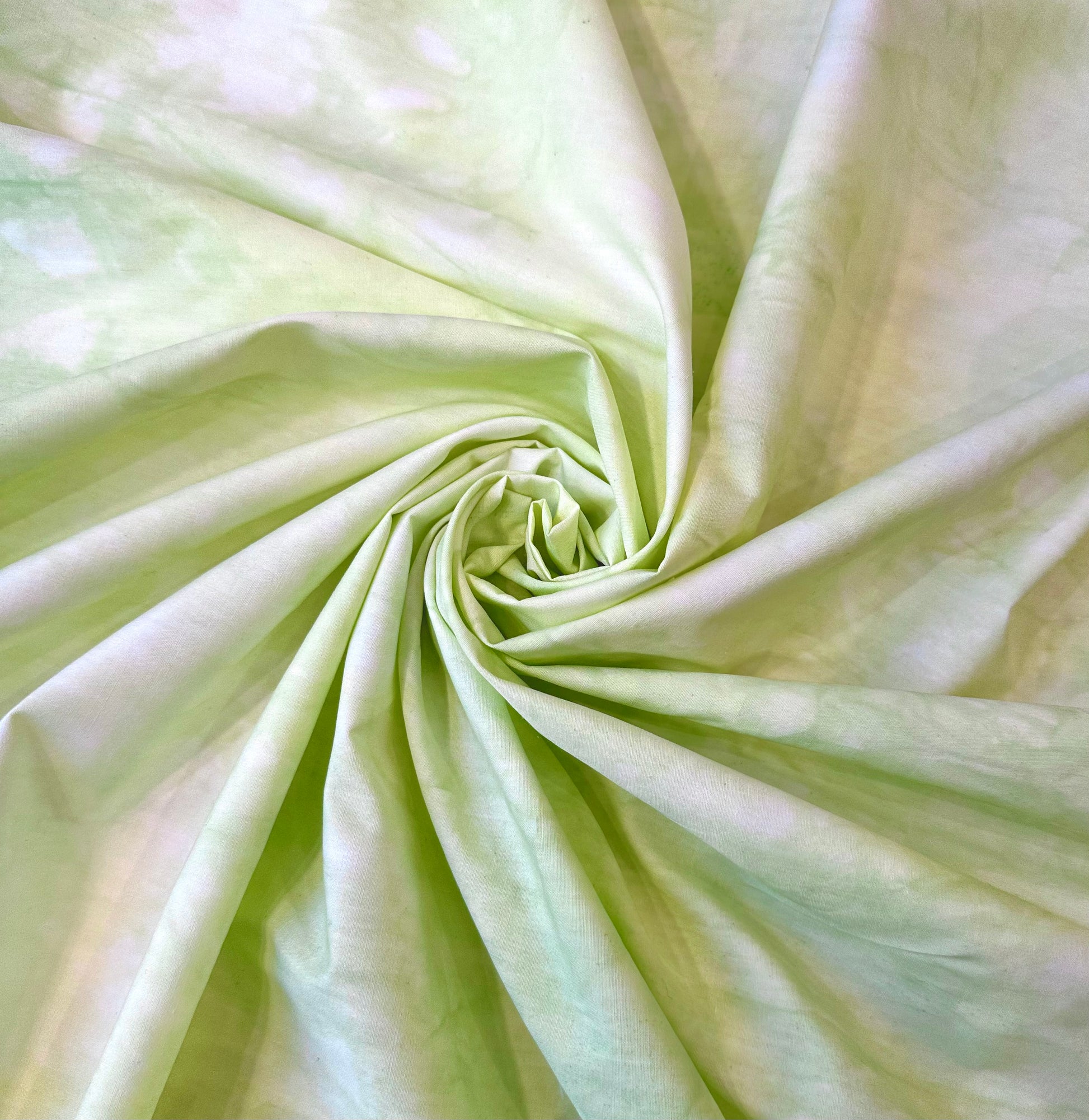 Laissez-vous séduire par cette popeline de coton française au motif tie and dye dans des nuances aériennes de vert pomme, relevées de touches blanches délicates.