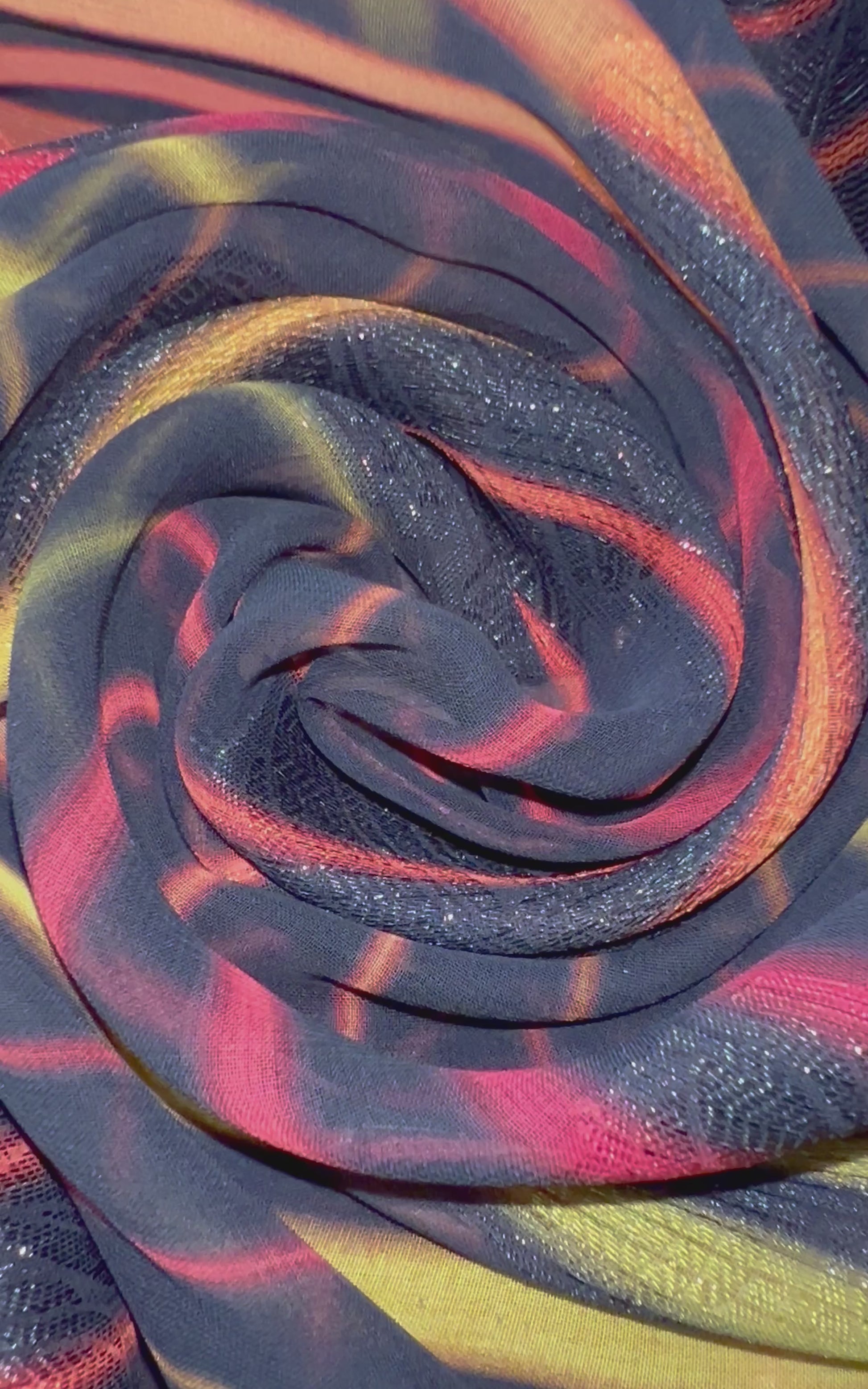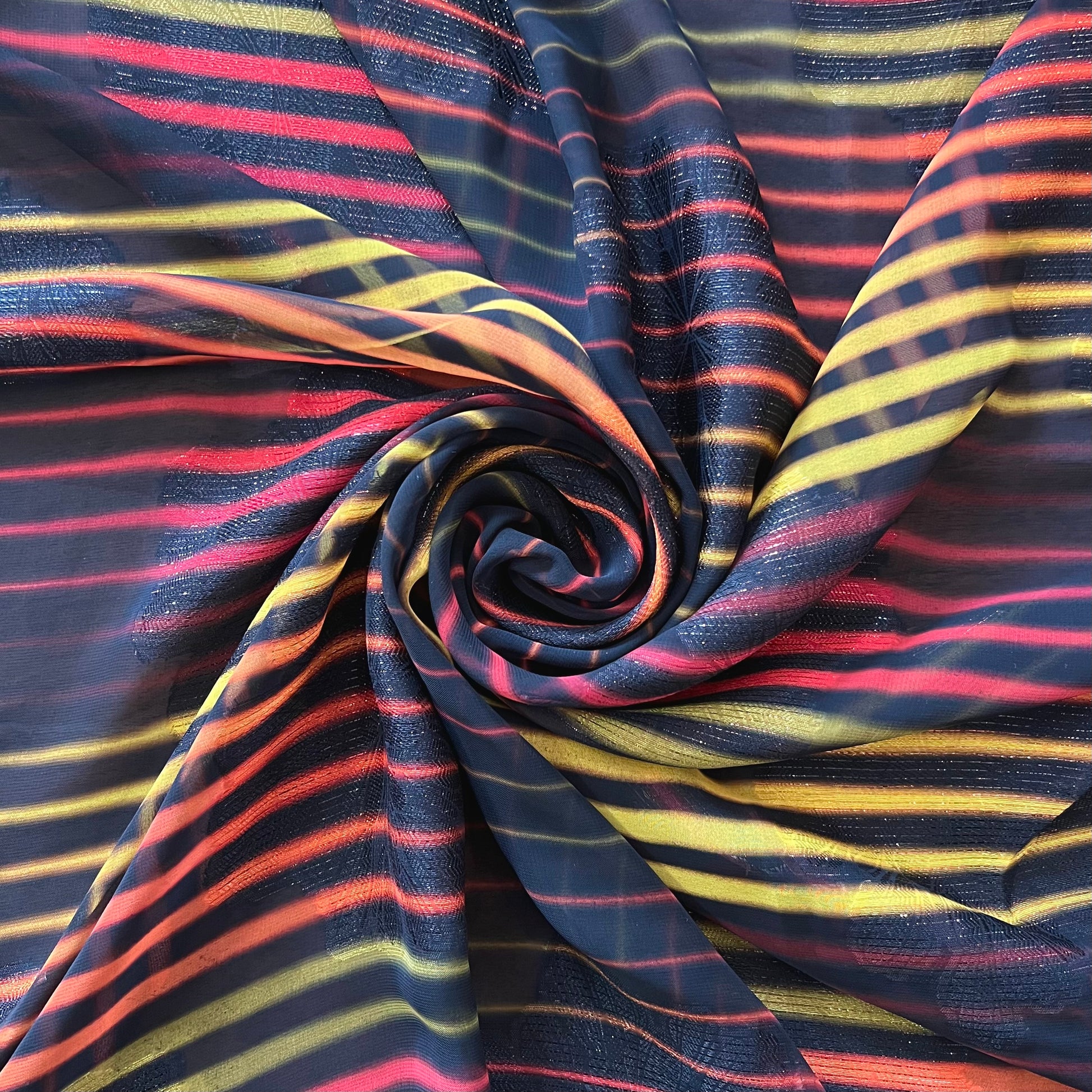 Le fond du tissu est d'un noir profond et intense, créant un contraste élégant avec les rayures multicolores qui le parcourent horizontalement. Les rayures, en dégradé de jaune, orange et rouge, apportent une touche de chaleur et de dynamisme, se fondant harmonieusement les unes dans les autres pour créer un effet visuel saisissant.