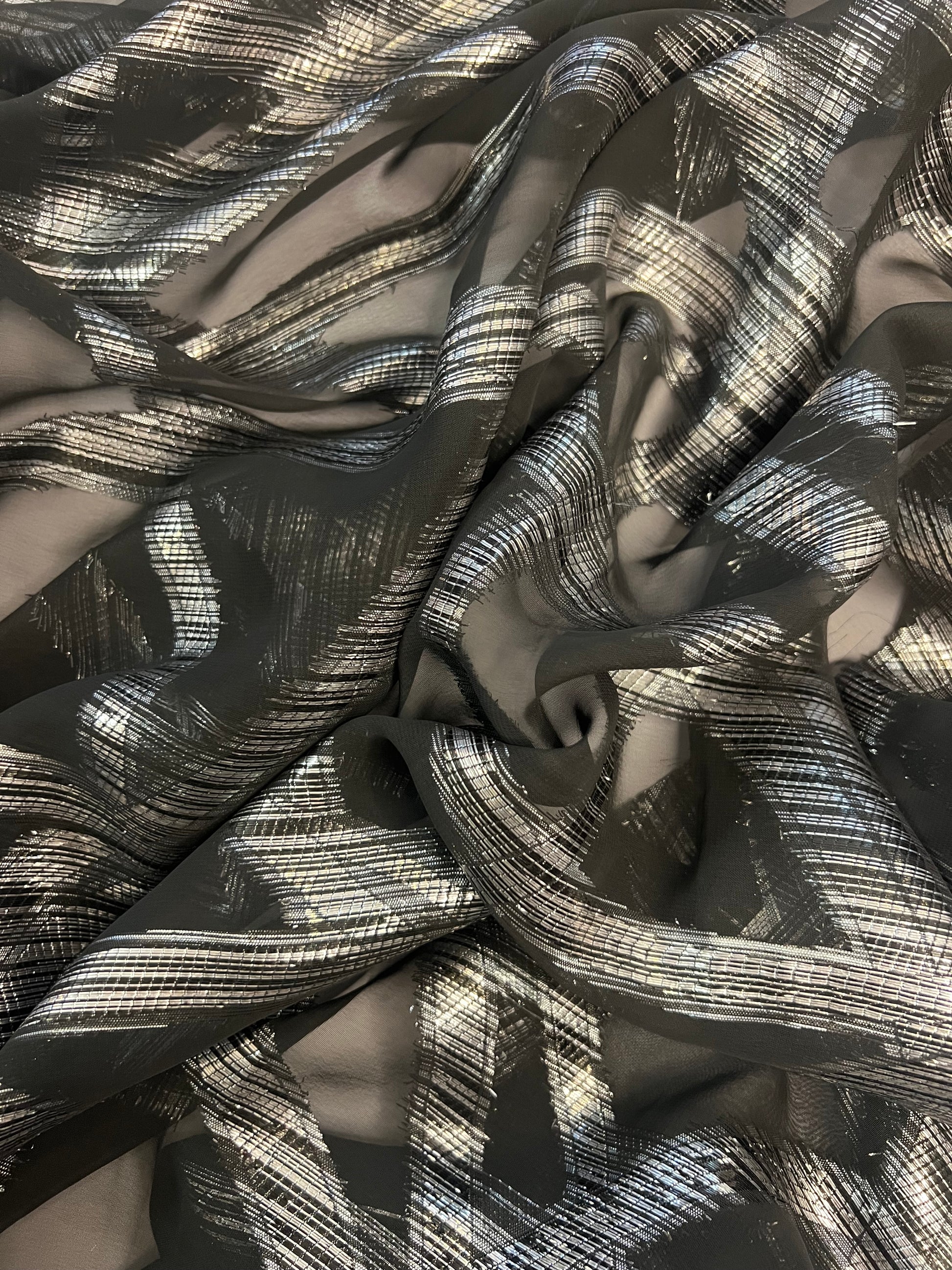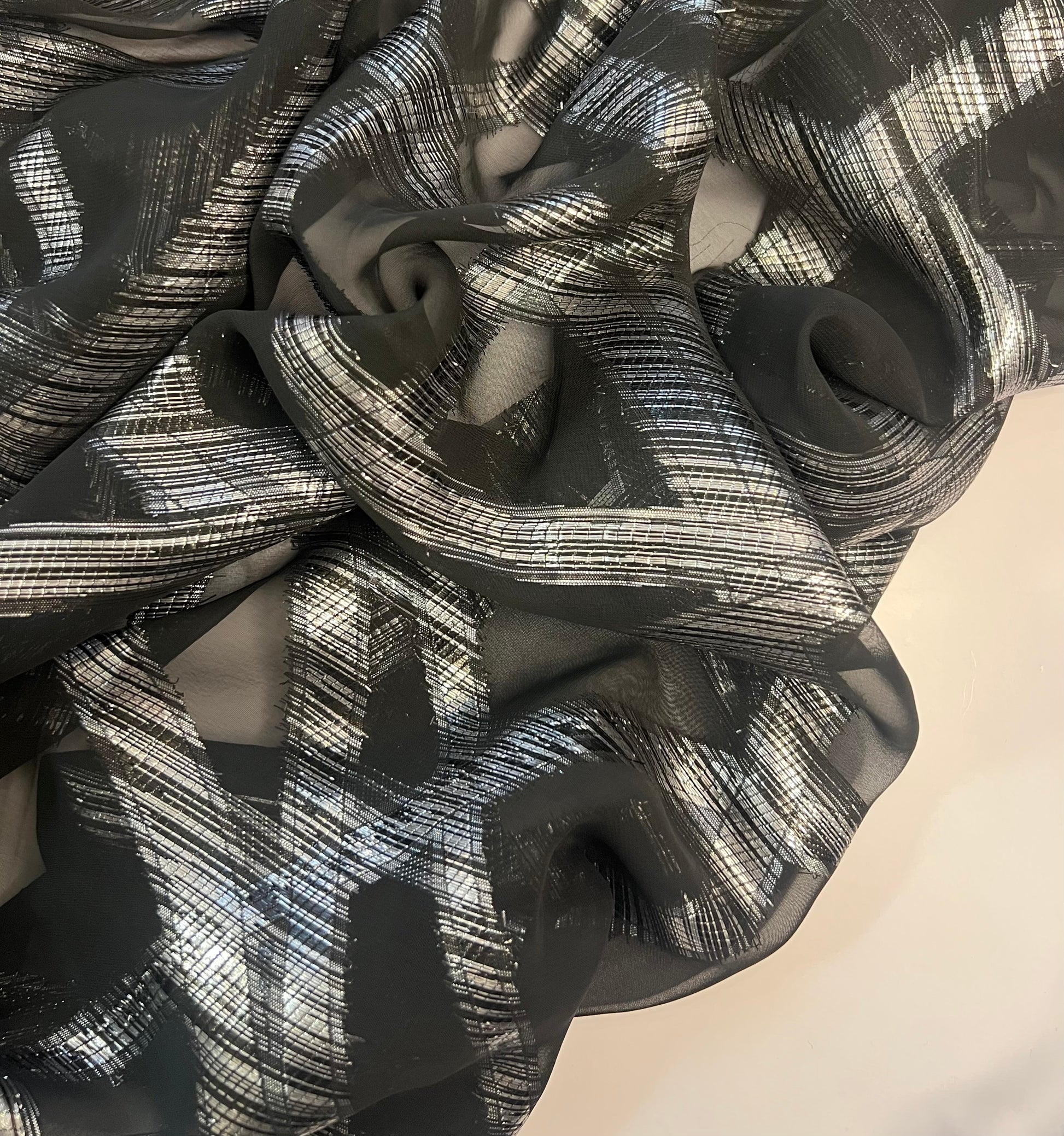 Parfait pour des créations haute couture, ce tissu se distingue par ses reflets argentés qui captent la lumière, offrant un éclat sans pareil à chaque mouvement.