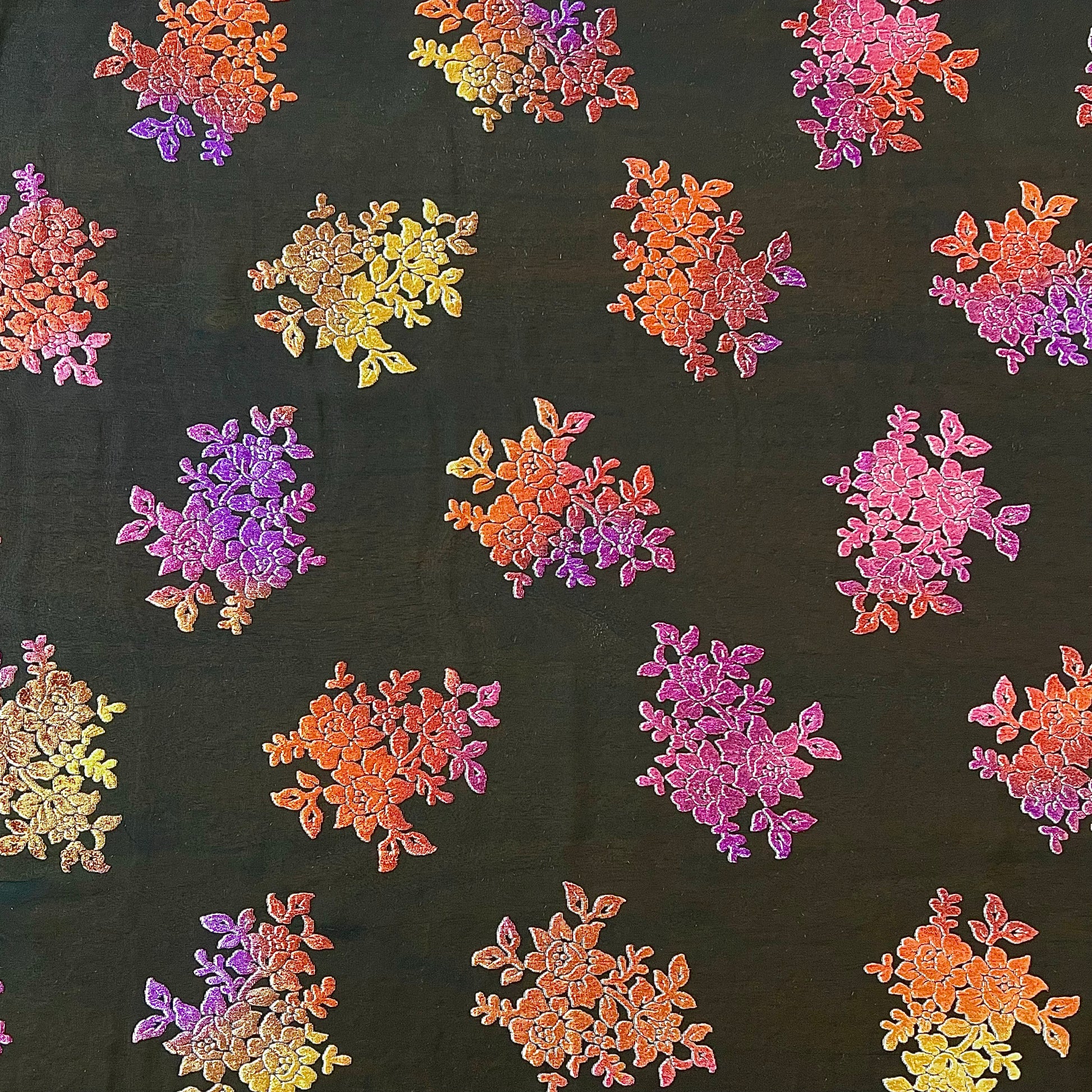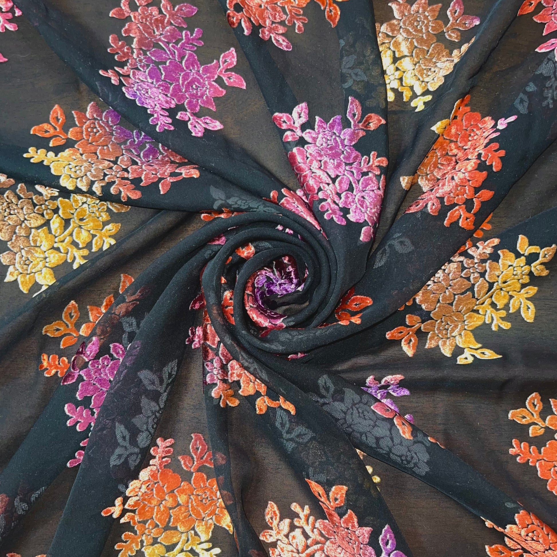 Le tissu dévoré est réalisé par une technique spéciale qui crée des motifs en transparence, offrant un jeu de textures unique. Les motifs floraux colorés semblent flotter sur une base semi-transparente noire, donnant au tissu un effet visuel captivant.