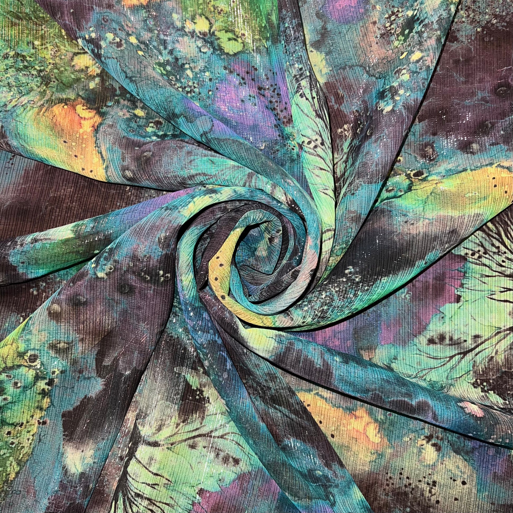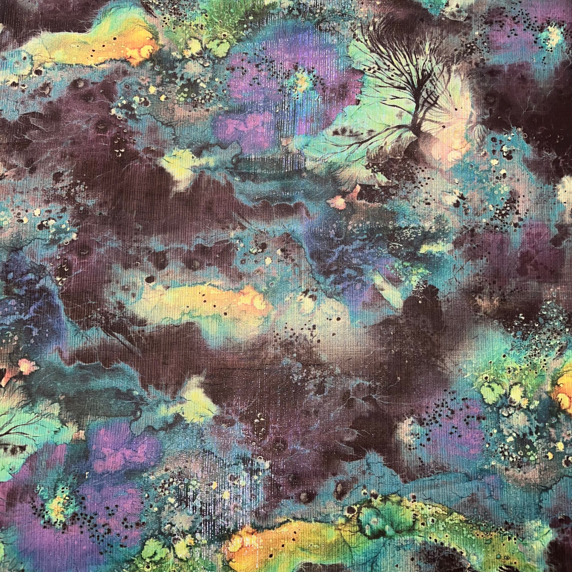 Le design de ce tissu est un hommage à la créativité et à l'art abstrait. Les nuances de vert, de turquoise, de violet et jaune se mélangent harmonieusement, évoquant des paysages oniriques et des formes organiques qui captent immédiatement l'attention.