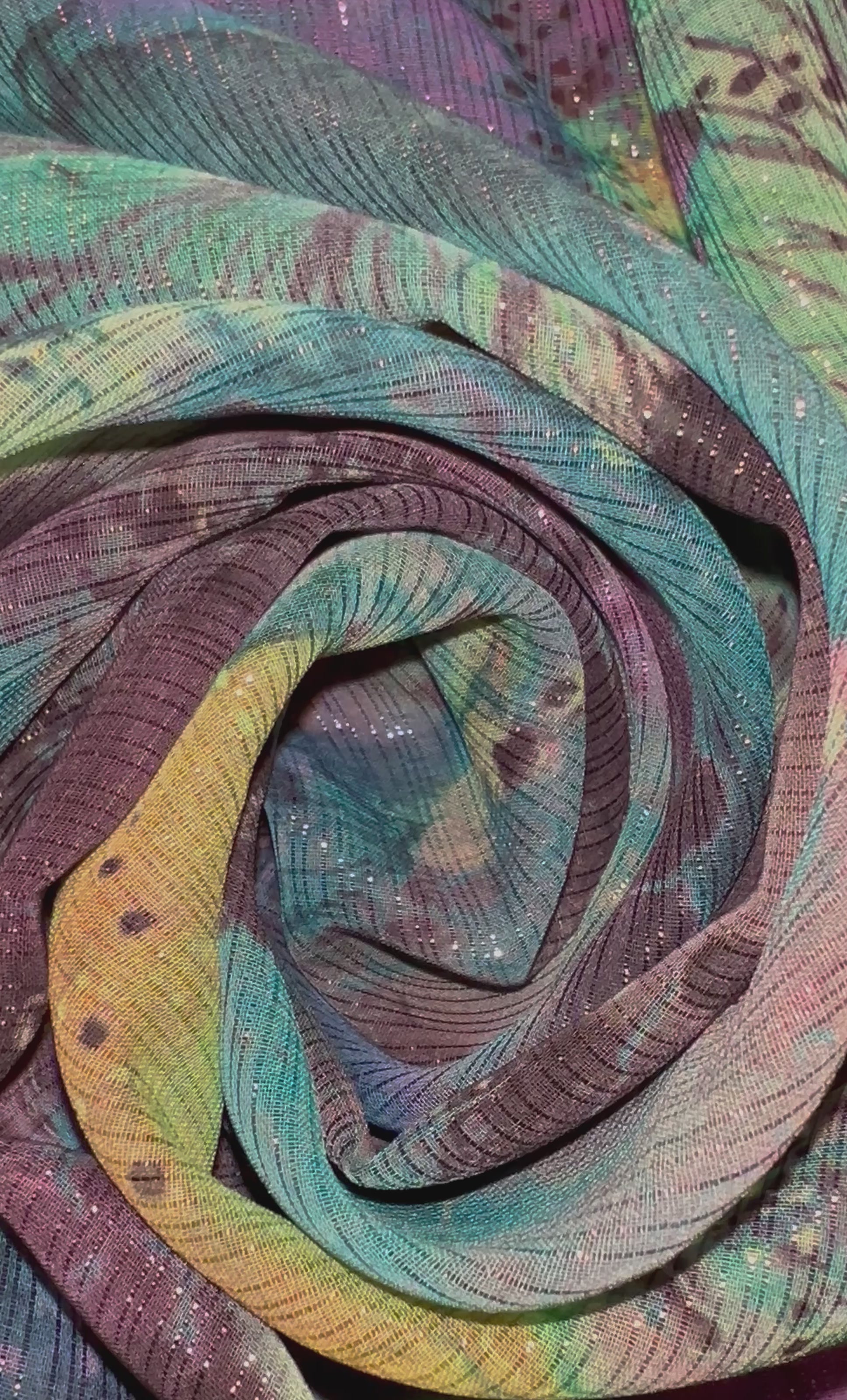 Chaque mètre de ce tissu raconte une histoire unique, où les couleurs se fondent et s'entremêlent pour créer des motifs aléatoires et pourtant parfaitement équilibrés.