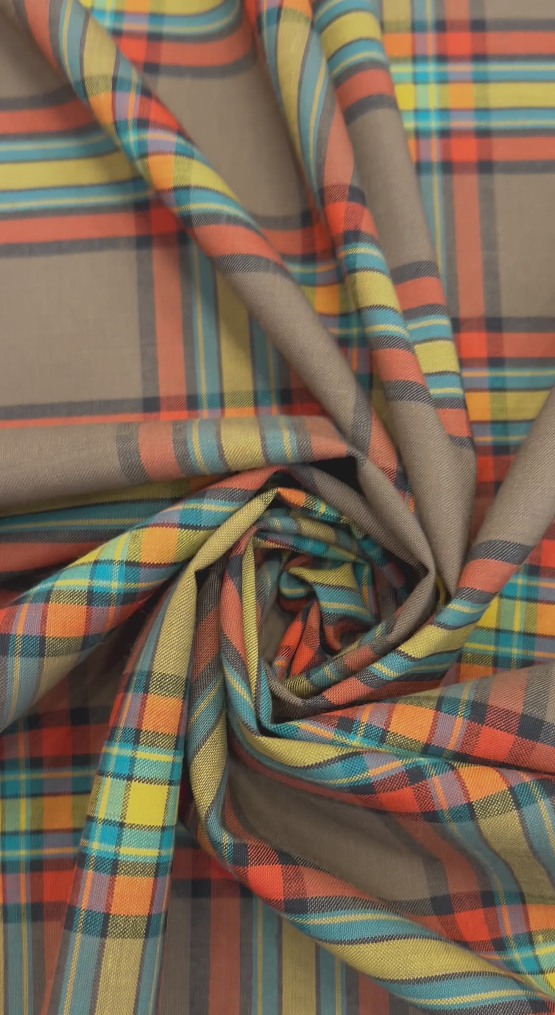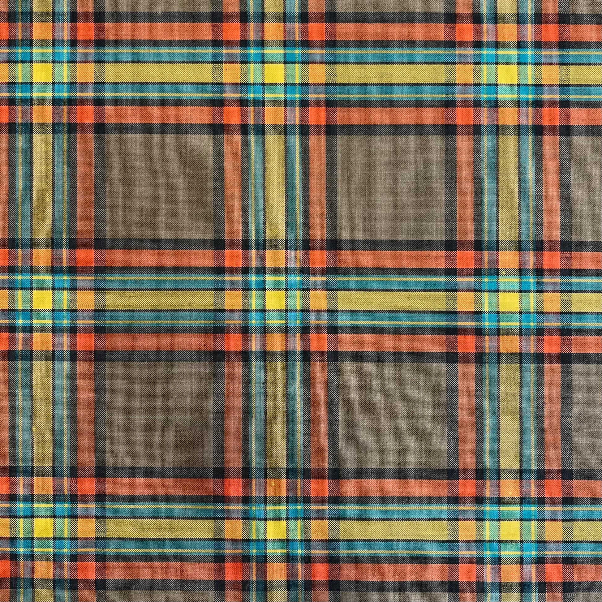 Le motif à carreaux, inspiré des classiques tartans, est revisité avec des teintes chaleureuses et vibrantes : des notes de jaune moutarde, de bleu sarcelle, d'orange et de vert olive se rencontrent pour créer un design audacieux qui ne passe pas inaperçu.