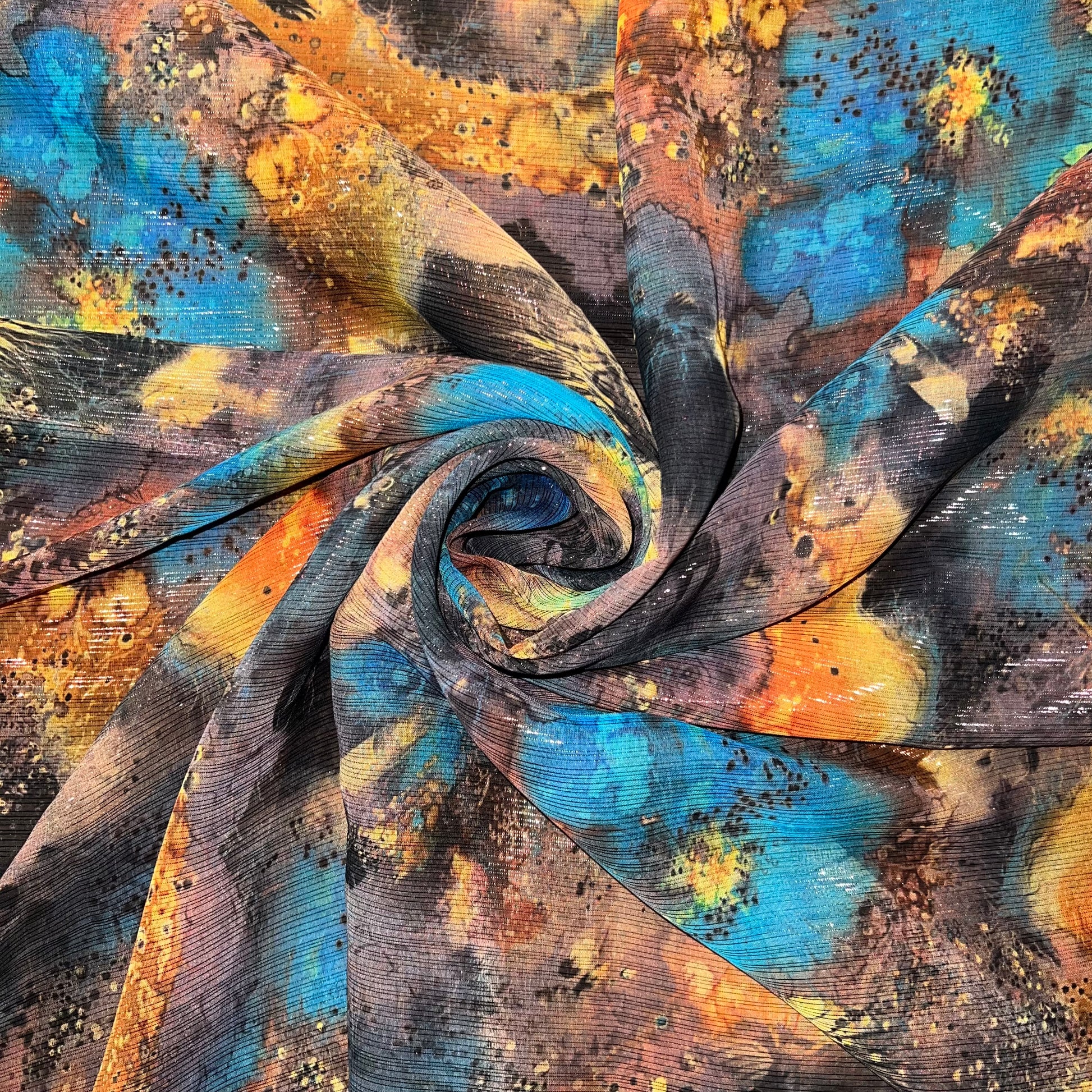 Le design de ce tissu est un hommage à la créativité et à l'art abstrait. Les nuances d'orange, de turquoise et de jaune se mélangent harmonieusement, évoquant des paysages oniriques et des formes organiques qui captent immédiatement l'attention.