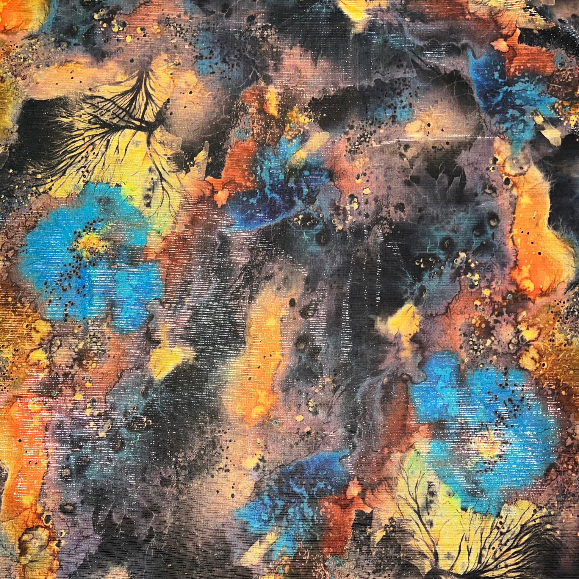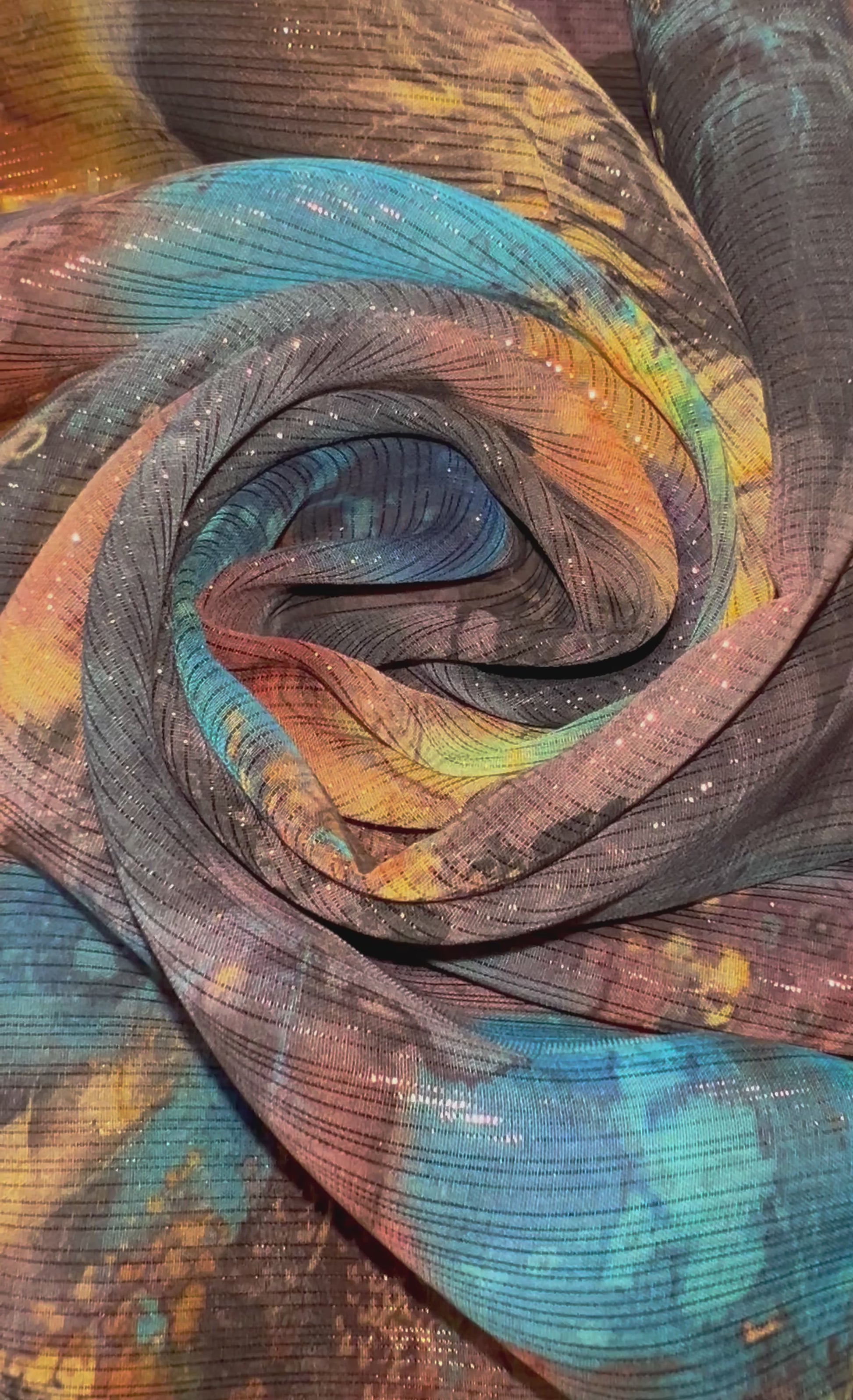 Chaque mètre de ce tissu raconte une histoire unique, où les couleurs se fondent et s'entremêlent pour créer des motifs aléatoires et pourtant parfaitement équilibrés.