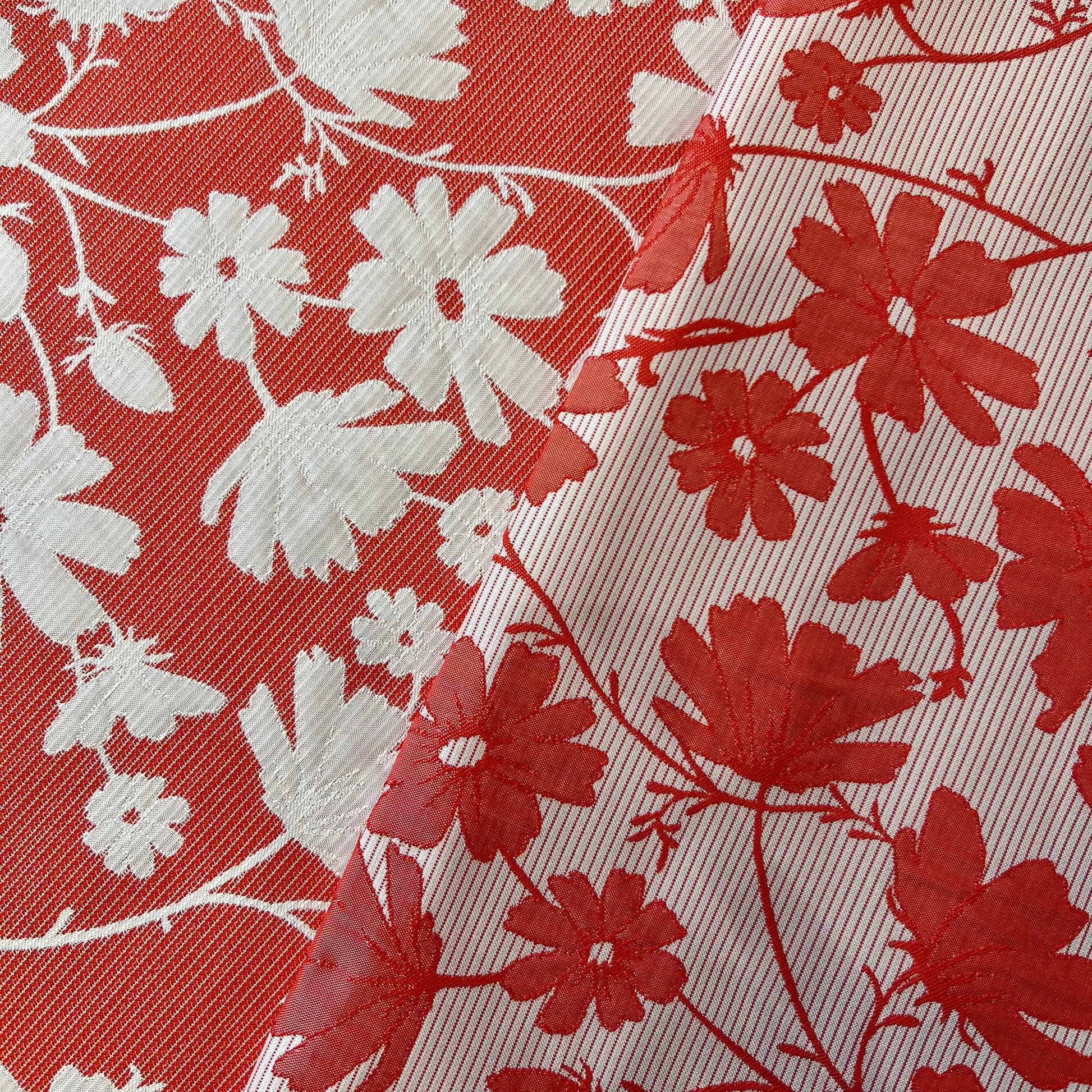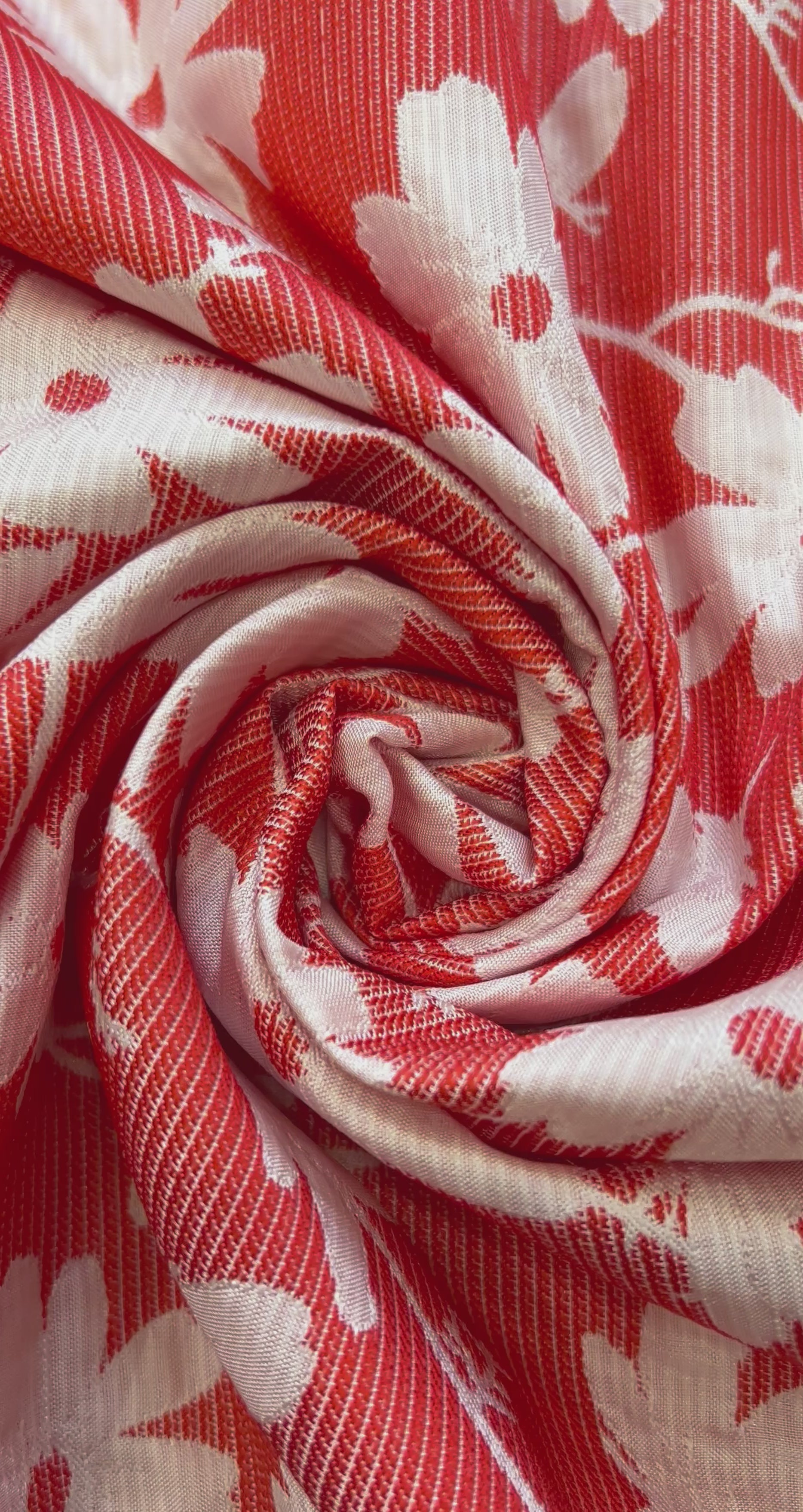 Ce tissu se distingue par son motif floral audacieux et vibrant en rouge éclatant, délicatement tissé sur un fond blanc rayé. Les grandes fleurs et les feuillages se détachent avec grâce, créant un effet visuel à la fois romantique et moderne, idéal pour des créations qui ne passent pas inaperçues.