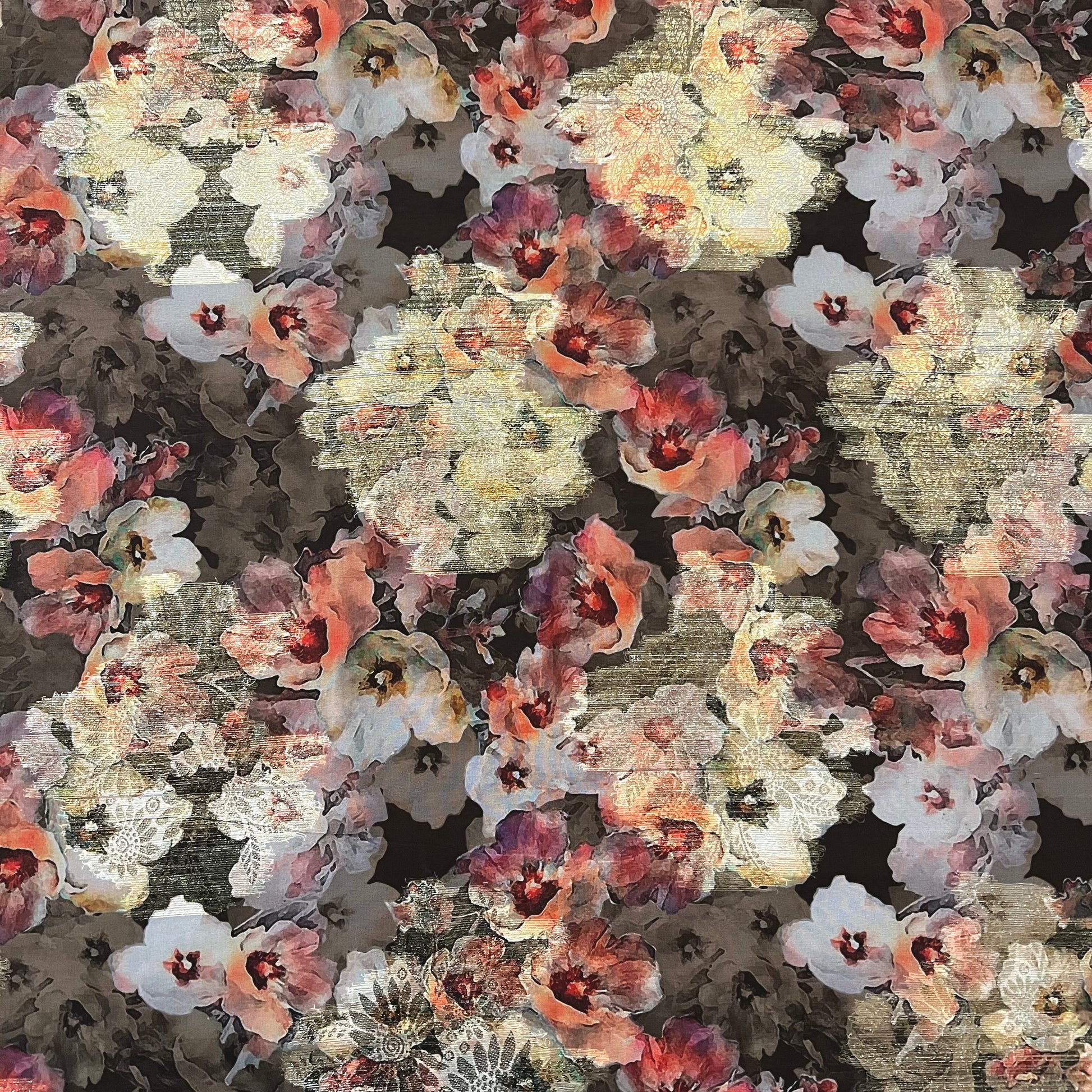 Ce tissu se distingue par un motif floral raffiné qui s’étend gracieusement sur toute la surface, créant un effet visuel riche et sophistiqué. Les fleurs, dans des nuances subtiles de rose, corail, et crème, sont minutieusement imprimées sur une base sombre, offrant un contraste saisissant qui met en valeur chaque détail du design.