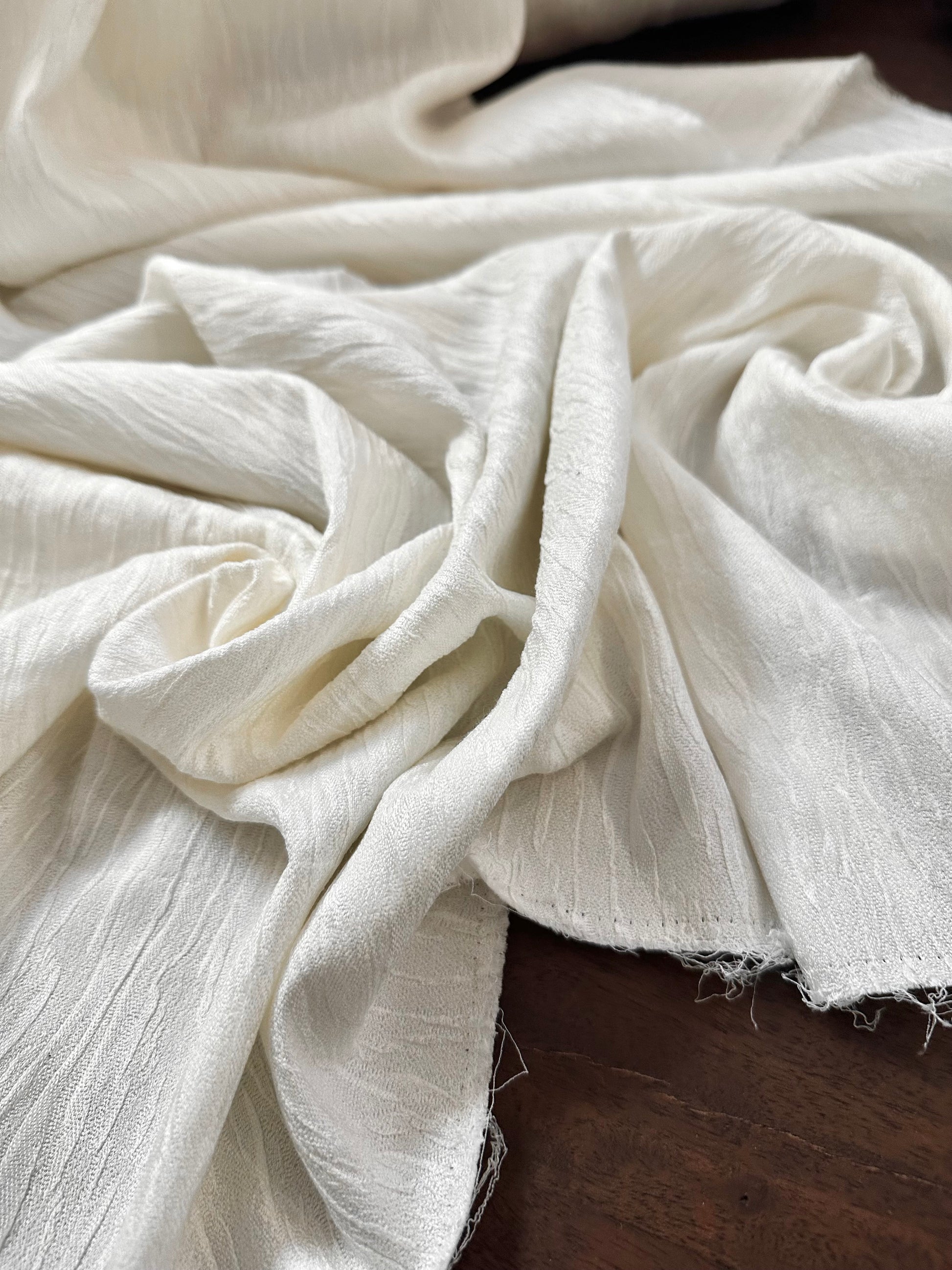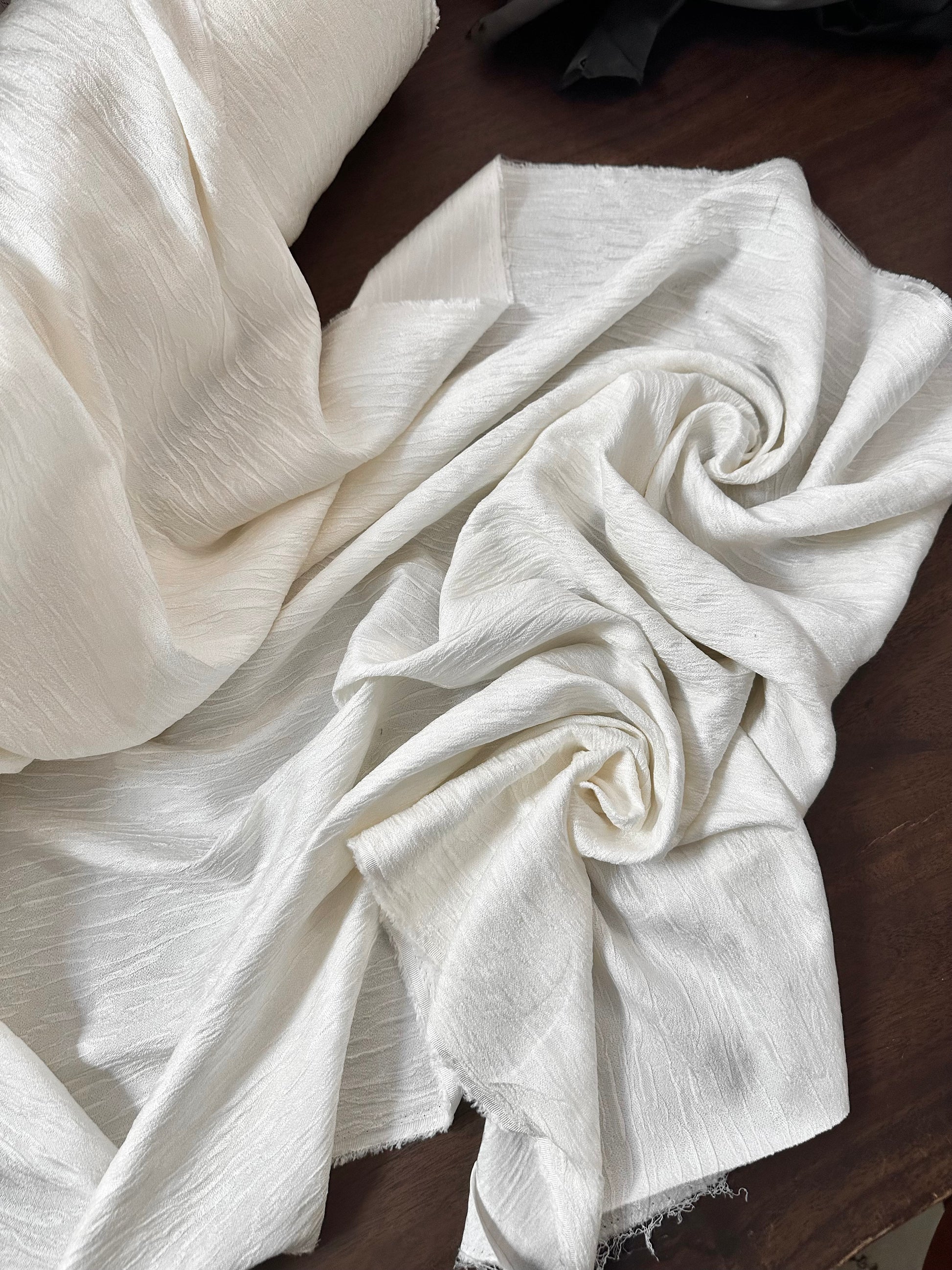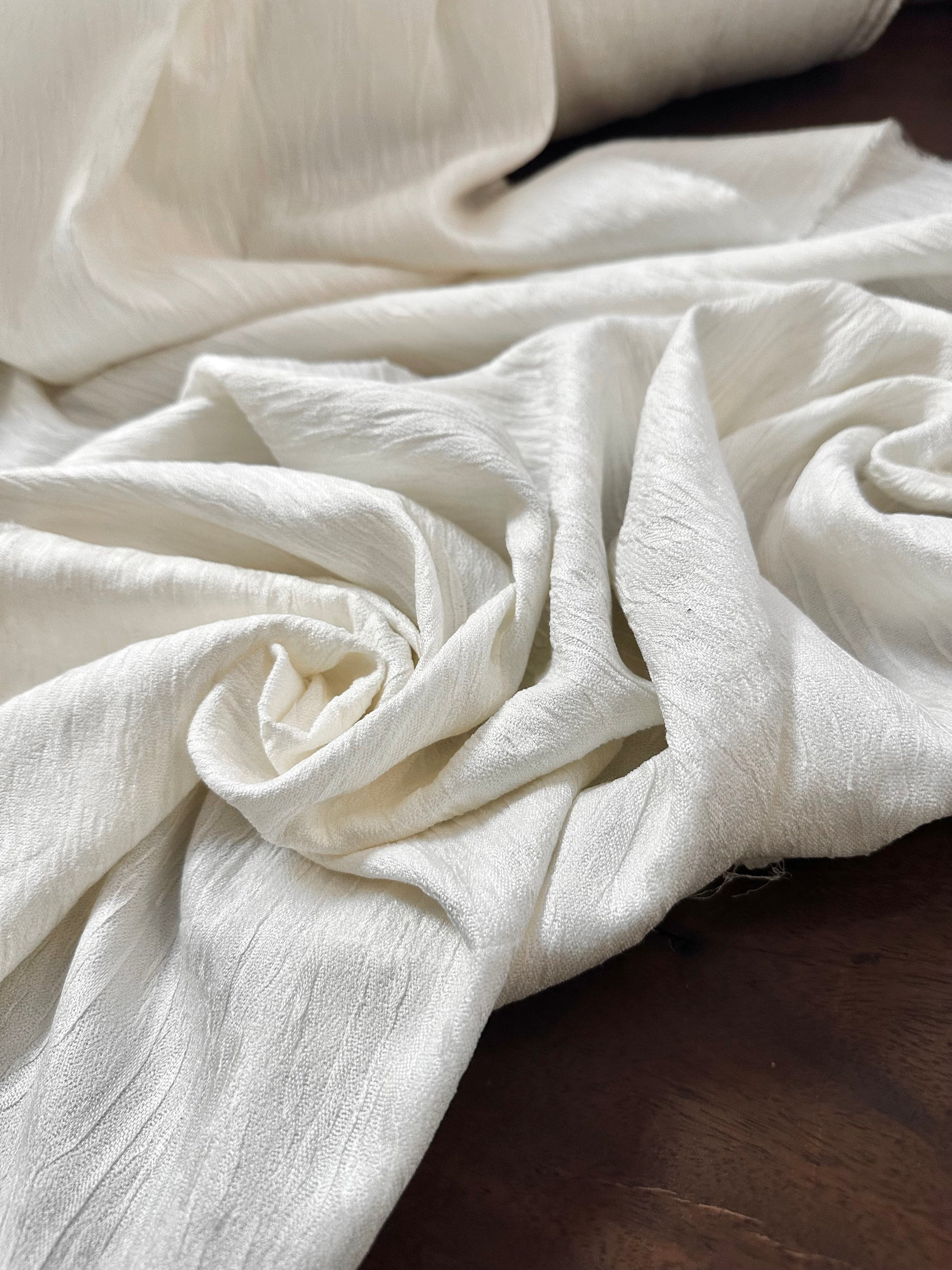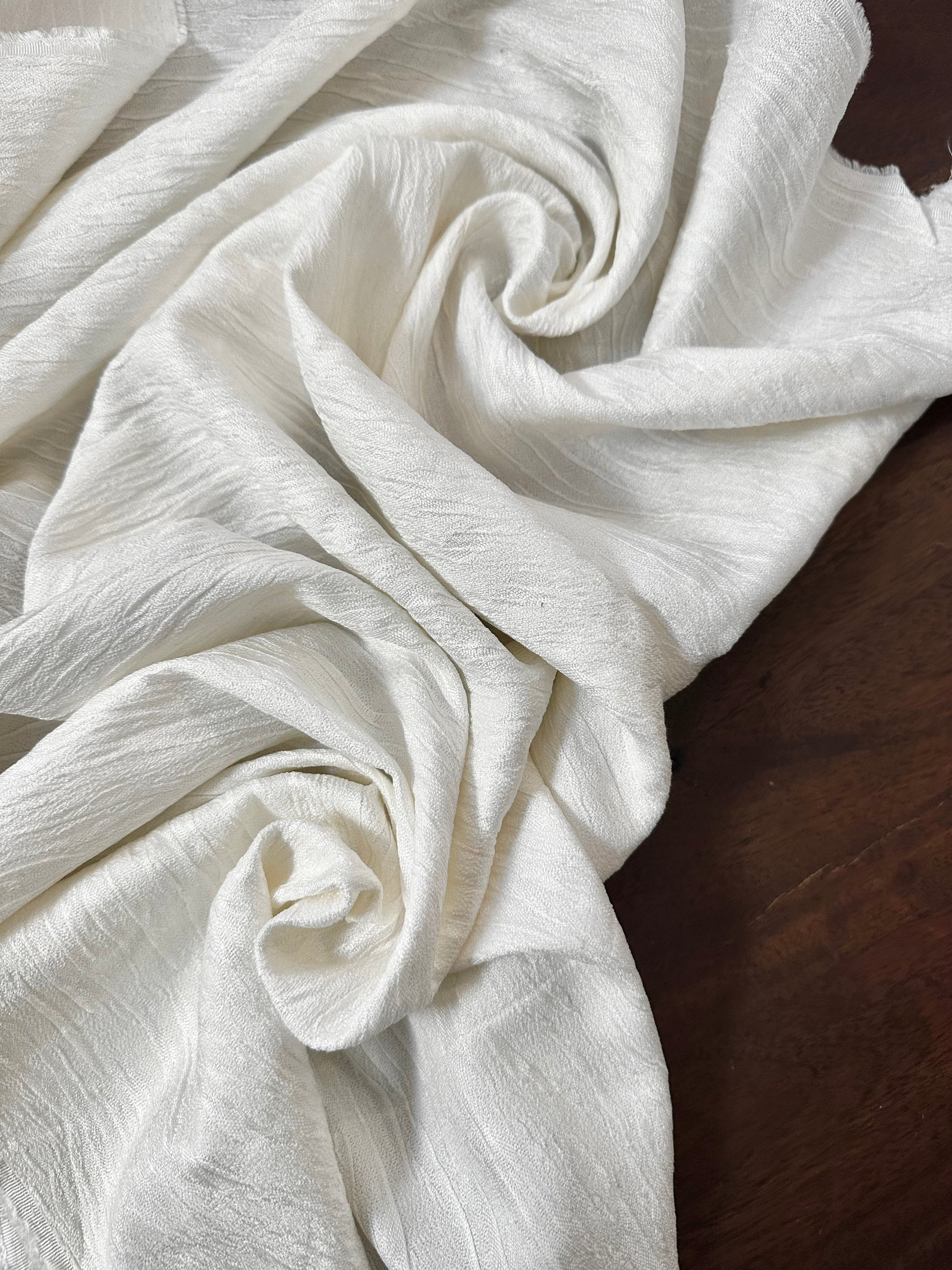 Entièrement composé de soie naturelle (100%), ce tissu présente une texture délicatement plissée et irrégulière, qui lui confère un tombé fluide et lumineux. Son coloris ivoire éclatant sublime la finesse de la matière et lui offre une élégance intemporelle.