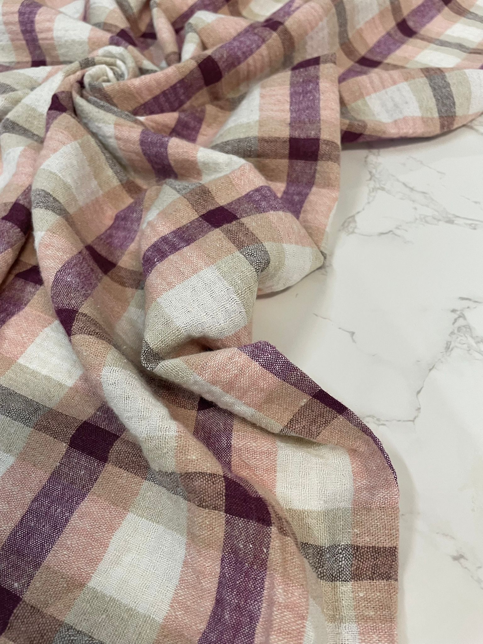 Découvrez notre gaze de coton à carreaux, un tissu léger, respirant et agréable au toucher, idéal pour toutes vos créations confortables et estivales. Son tissage aérien lui confère une texture douce et légèrement gaufrée, tandis que son motif à carreaux dans des tons naturels et prune apporte une note authentique et moderne à vos projets.