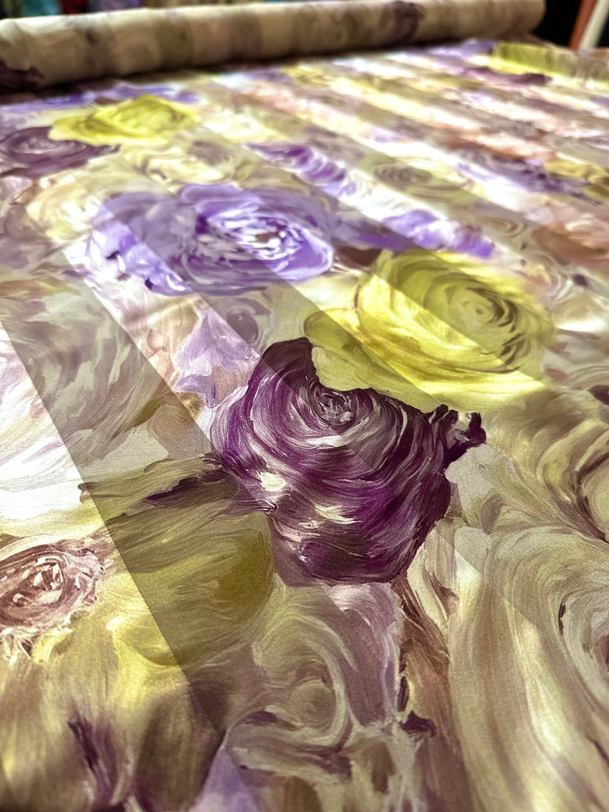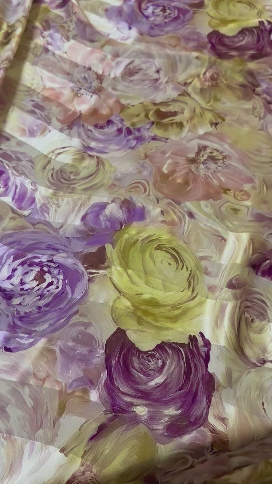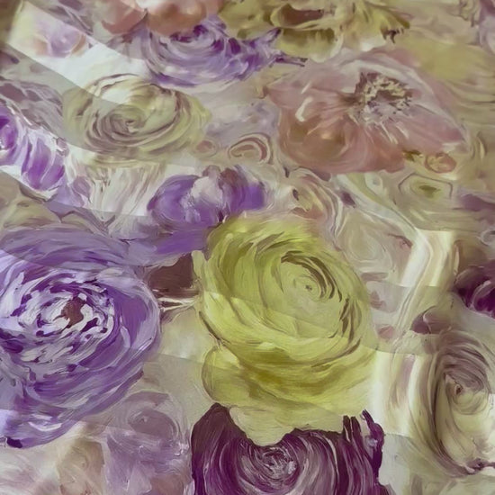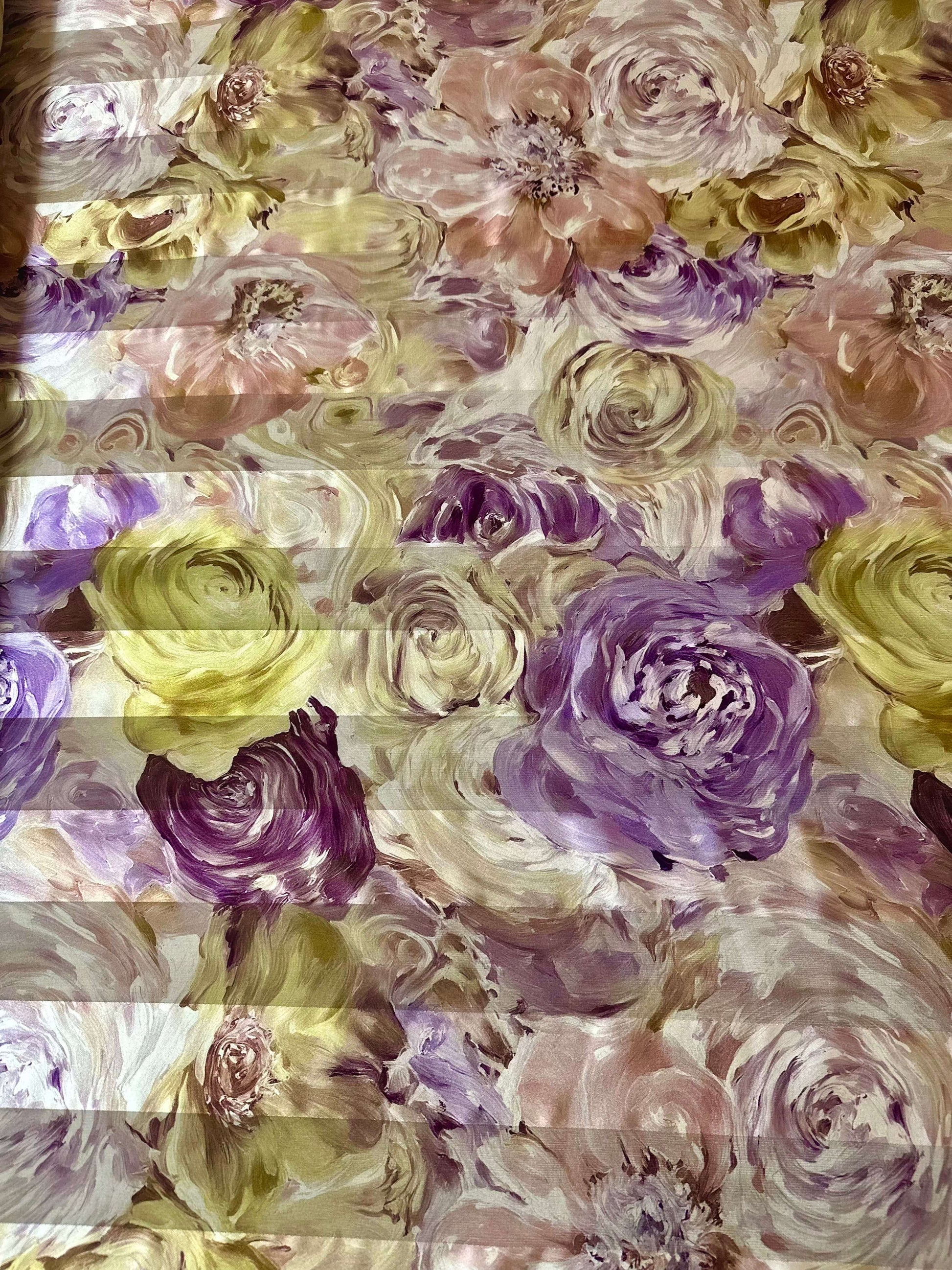 Son imprimé floral, véritable explosion de couleurs, mêle avec grâce des nuances de vert vibrant, de violet profond et de rose pâle délicat. Chaque fleur semble danser sur le tissu, apportant une touche de fraîcheur et de poésie à vos projets.