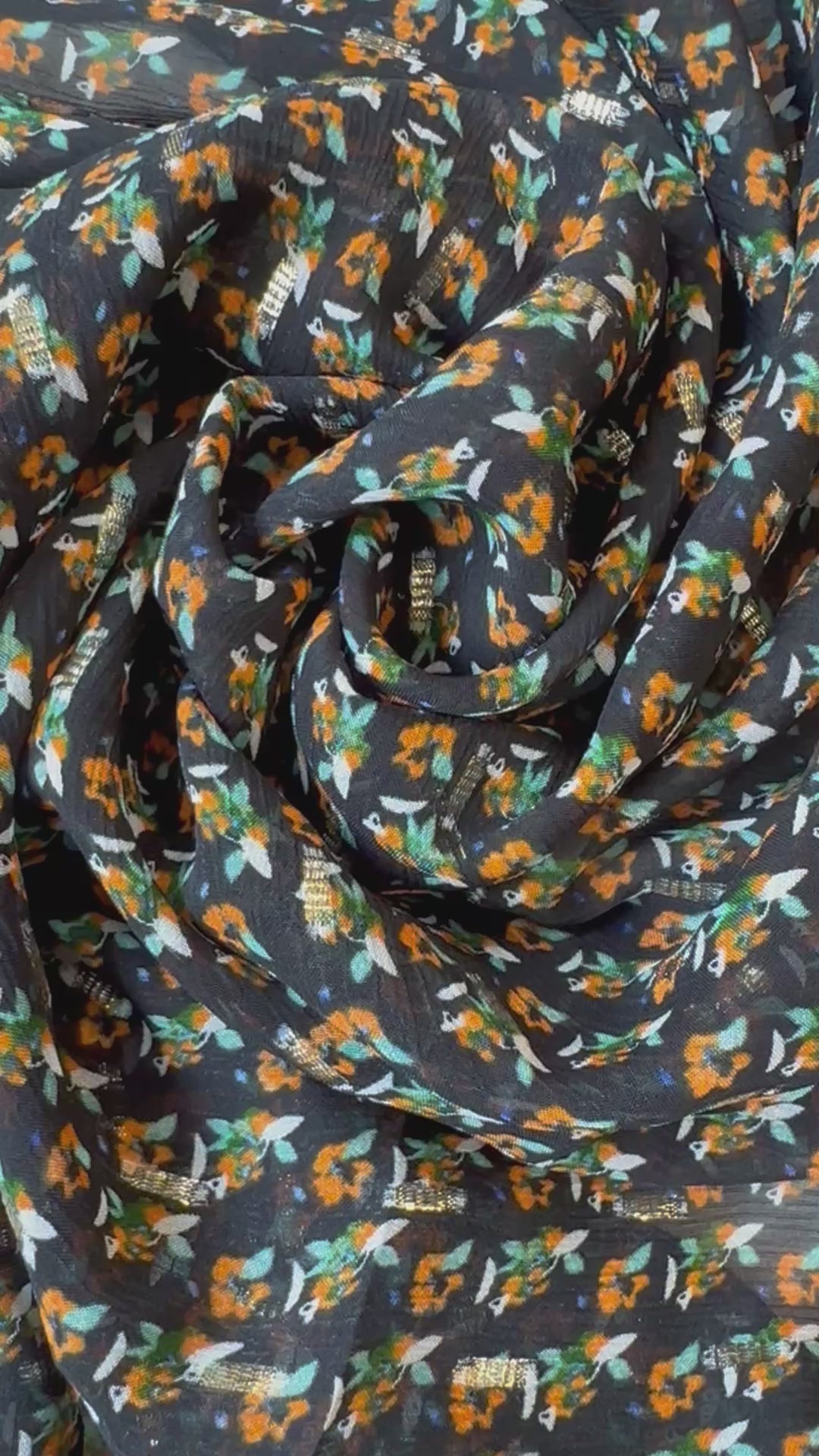 Découvrez notre superbe mousseline crinkle à fond noir, un tissu raffiné et original composé à 75% de viscose, enrichi de délicates broderies lurex dorées (15%) qui captent la lumière avec élégance.