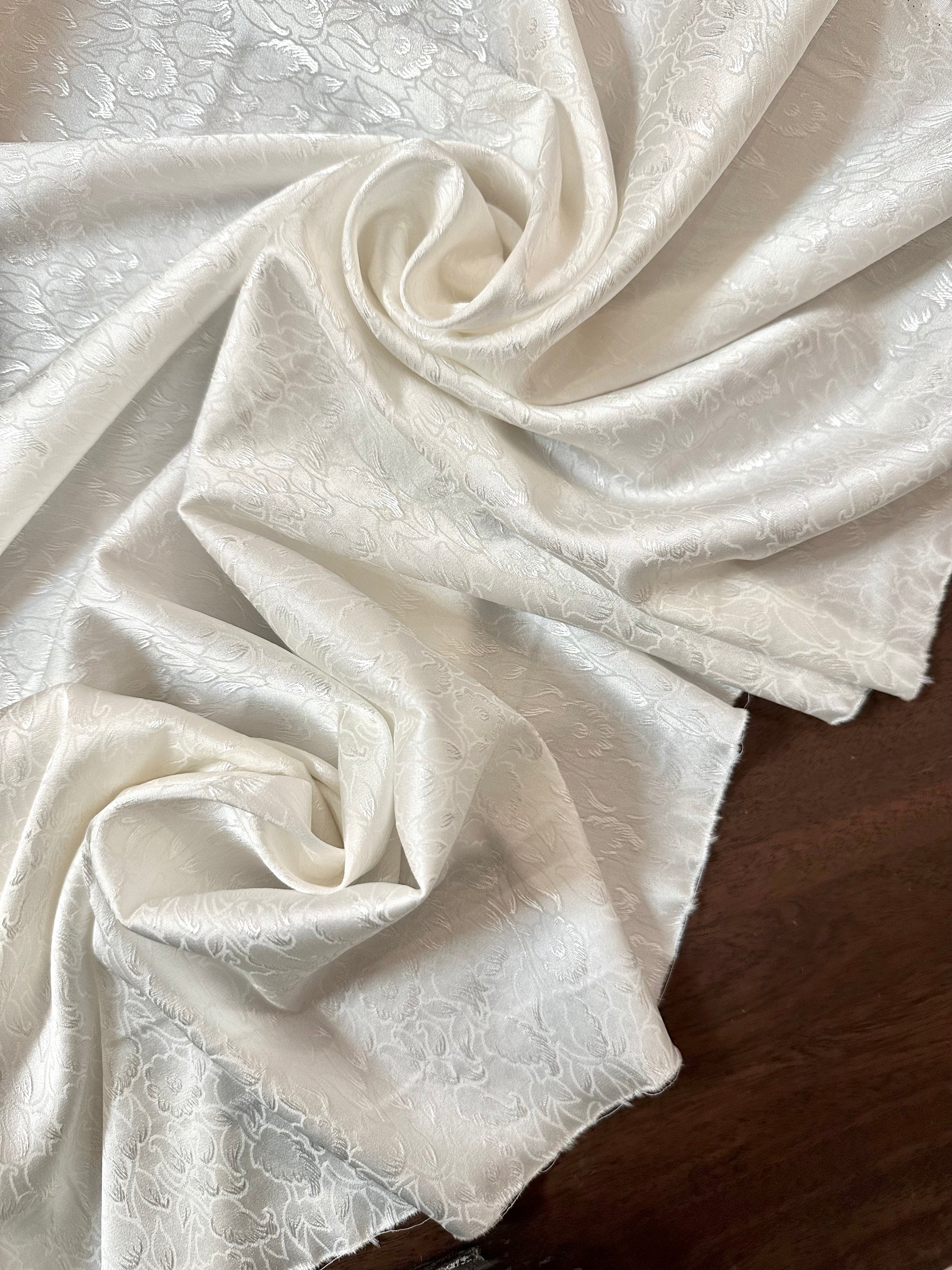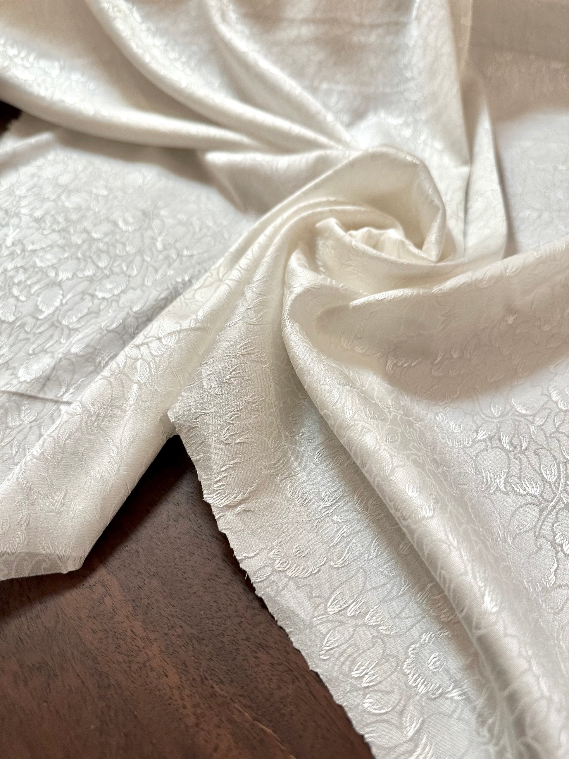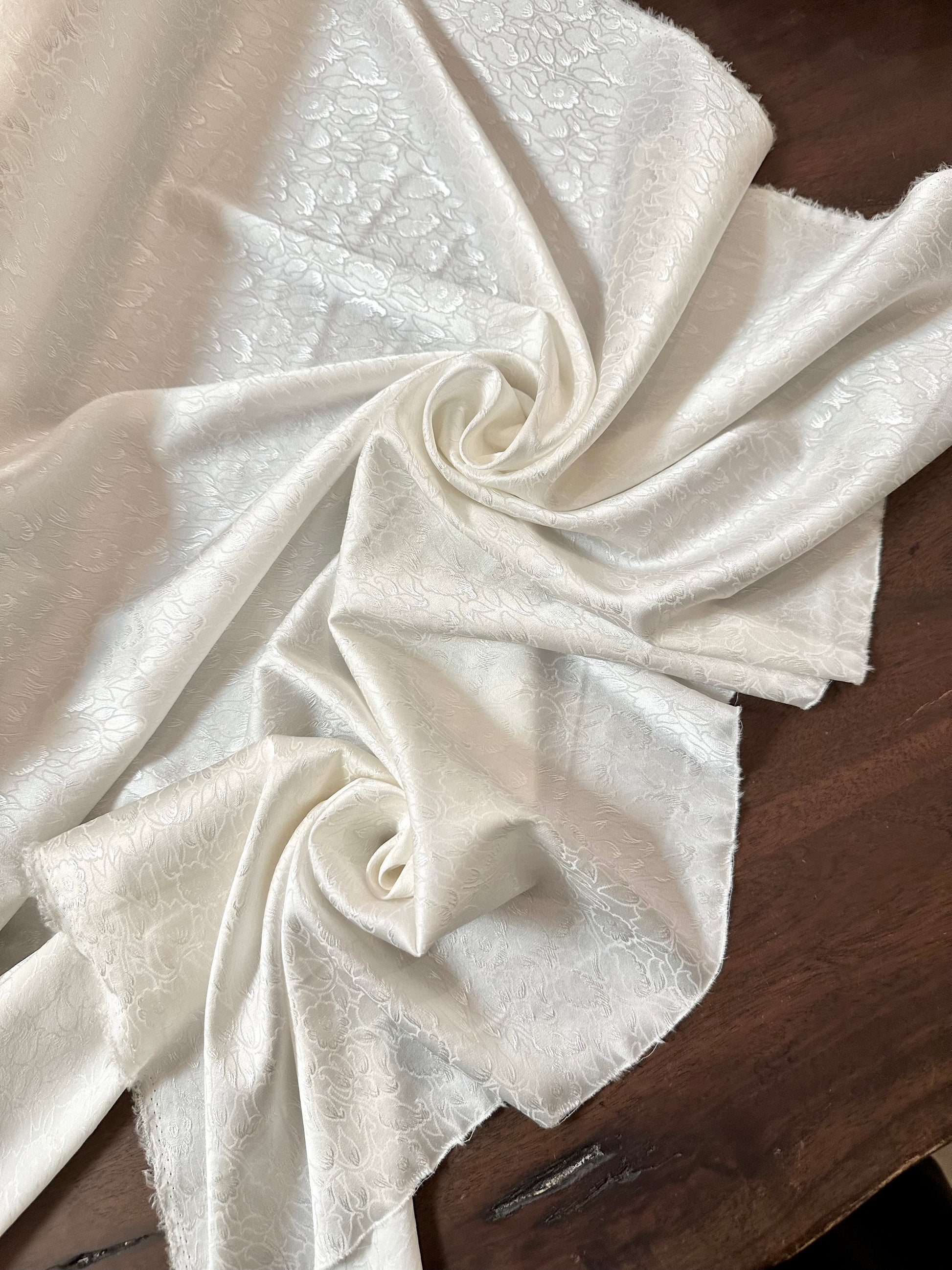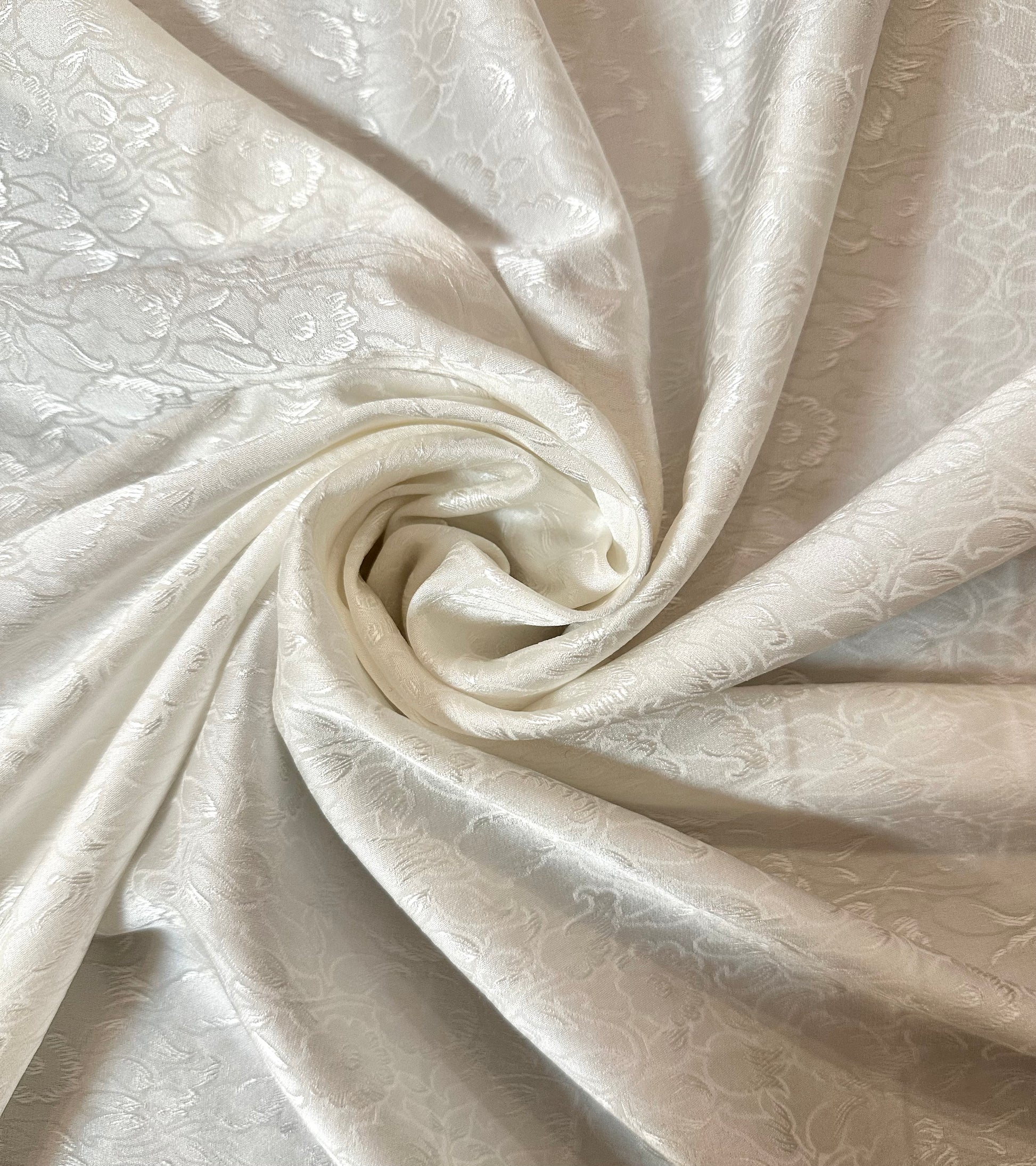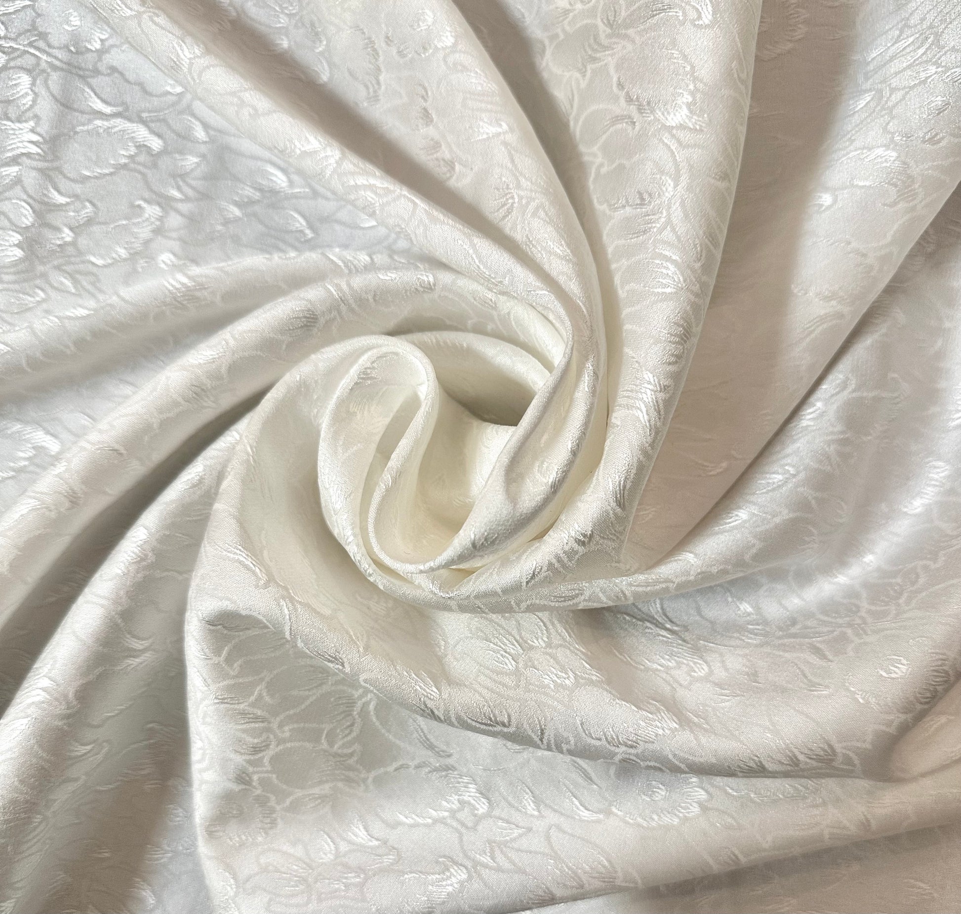 Son motif délicatement jacquardé ton sur ton met en valeur un jeu raffiné de lumière et de relief, idéal pour des pièces de haute couture, des robes de cérémonie, de la lingerie précieuse ou encore des détails sophistiqués de mode.