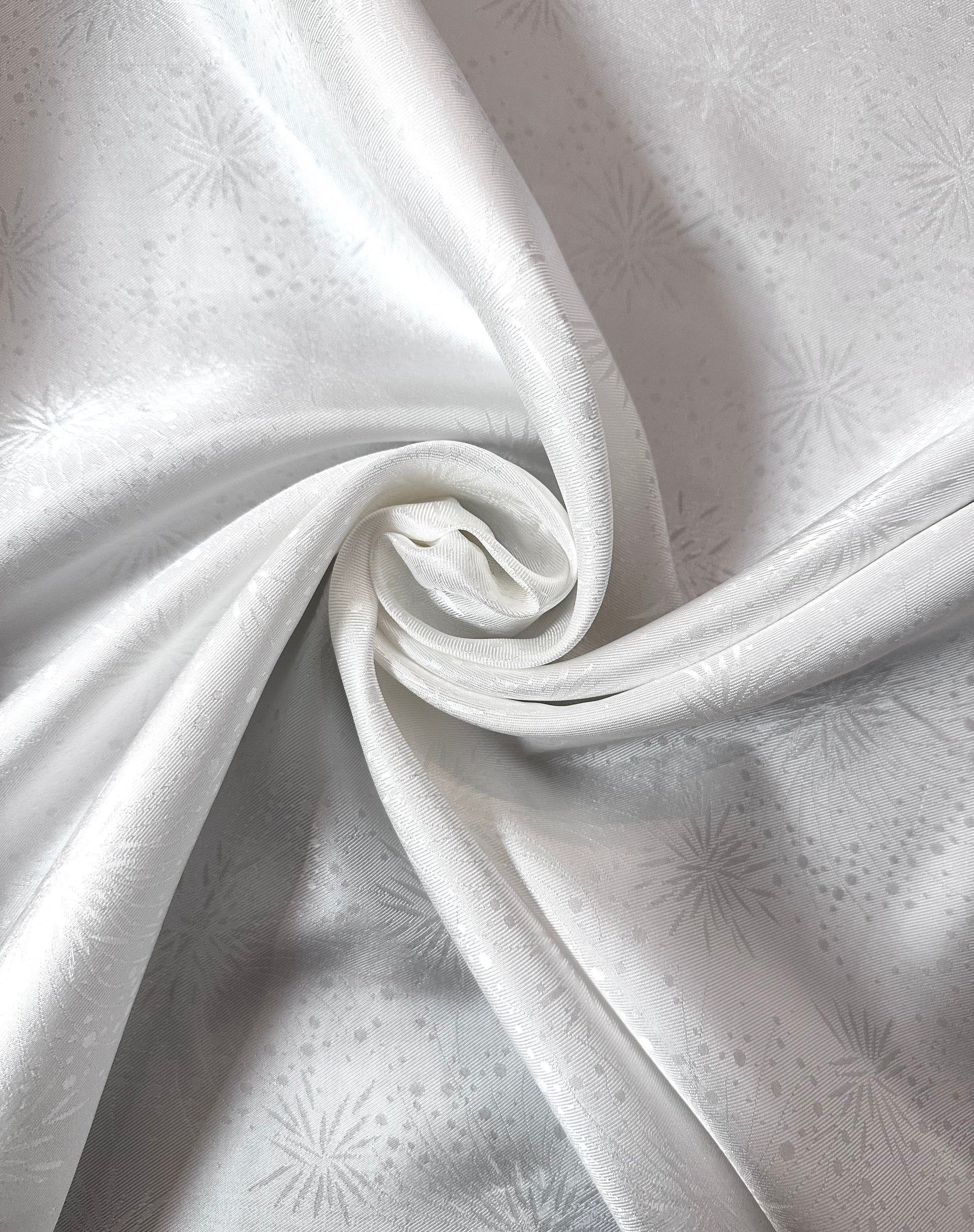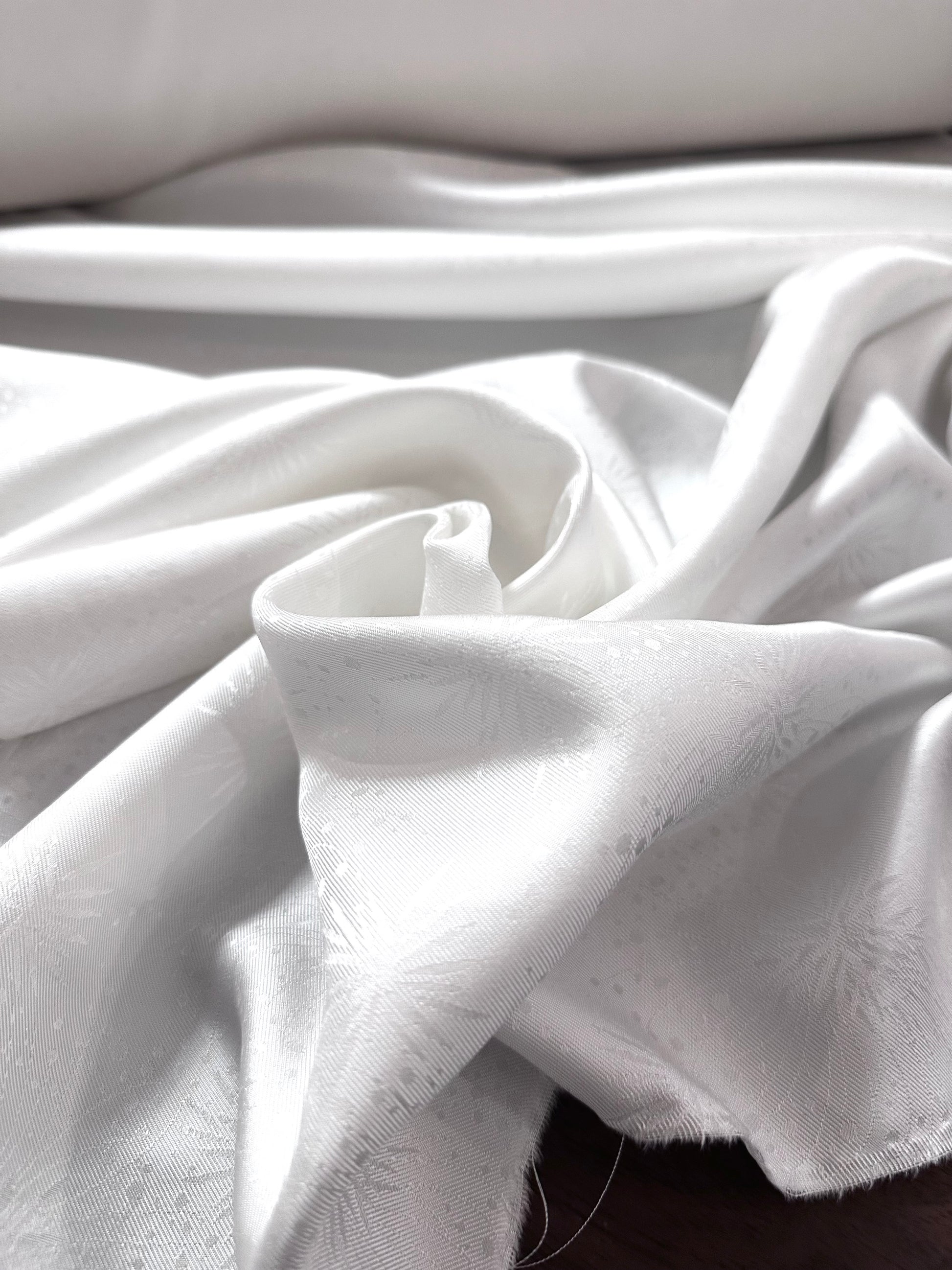 Ce somptueux tissu est composé de 100 % soie dans un blanc optique éclatant. Son tissage jacquard met en relief un délicat motif étoilé et texturé, jouant subtilement avec la lumière pour créer des reflets élégants et raffinés.