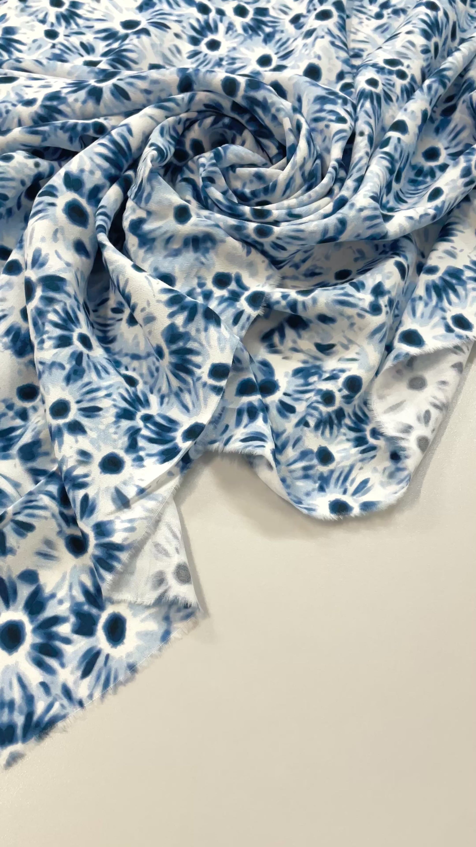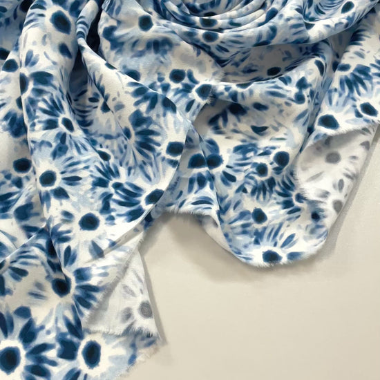Laisse-toi emporter par ce crêpe viscose effet peinture florale, où les nuances de bleu, de blanc et de noir se mêlent comme des coups de pinceau délicats. Le motif évoque une fleur qui se dévoile dans un mouvement artistique : parfois flou, parfois précis, toujours élégant. Le rendu a ce charme pictural qui attire l’œil sans jamais en faire trop.
