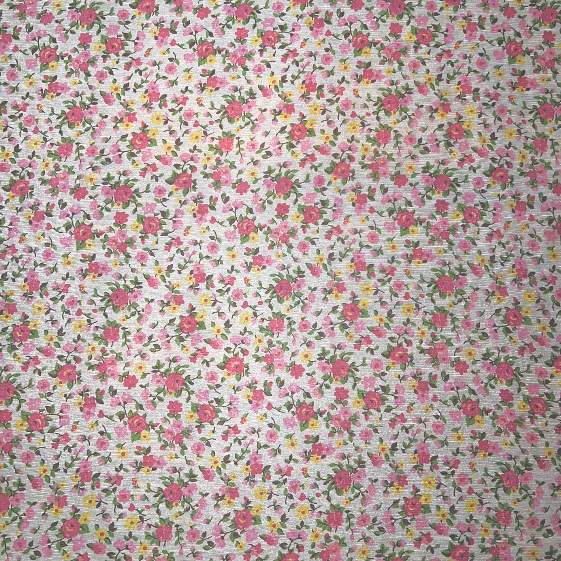 Ces fleurs sont finement dessinées dans des tons de rose bonbon et rose pâles avec des touches de jaune, créant un motif harmonieux et charmant.