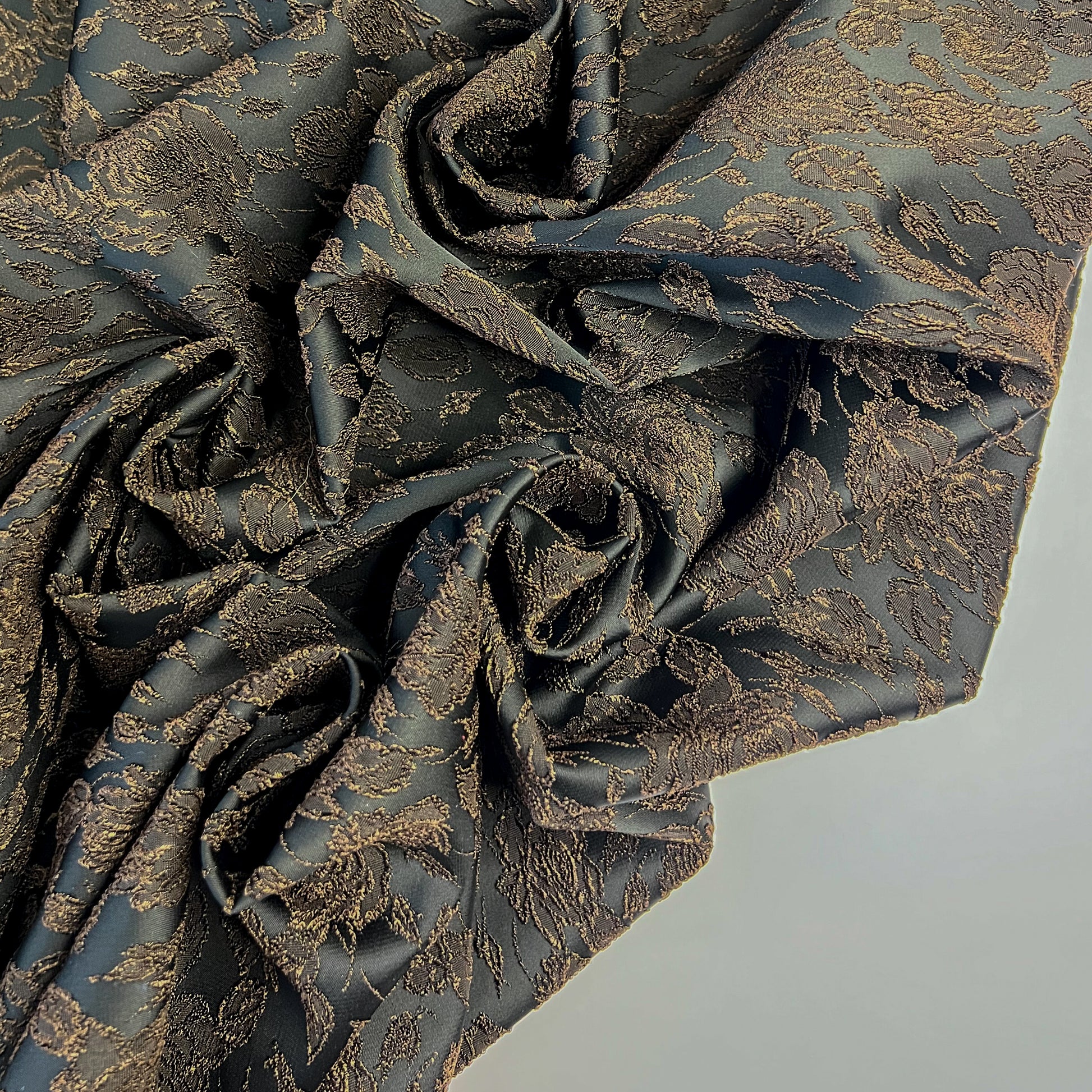 Ce tissu présente un magnifique motif jacquard brodé, avec de délicates petites fleurs marron sur un fond noir élégant.