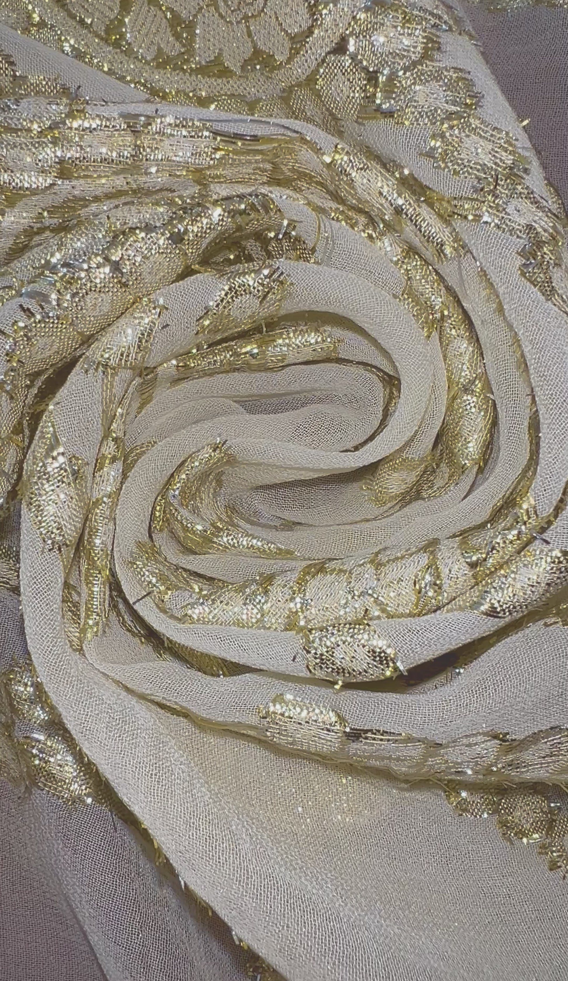 Ce tissu incarne l'élégance à l'état pur, alliant la légèreté aérienne de la mousseline à l'éclat somptueux du fil lurex doré. Le motif paisley, finement brodé avec des détails complexes, crée un jeu de lumière subtil et captivant, transformant chaque mouvement en une danse de reflets dorés.